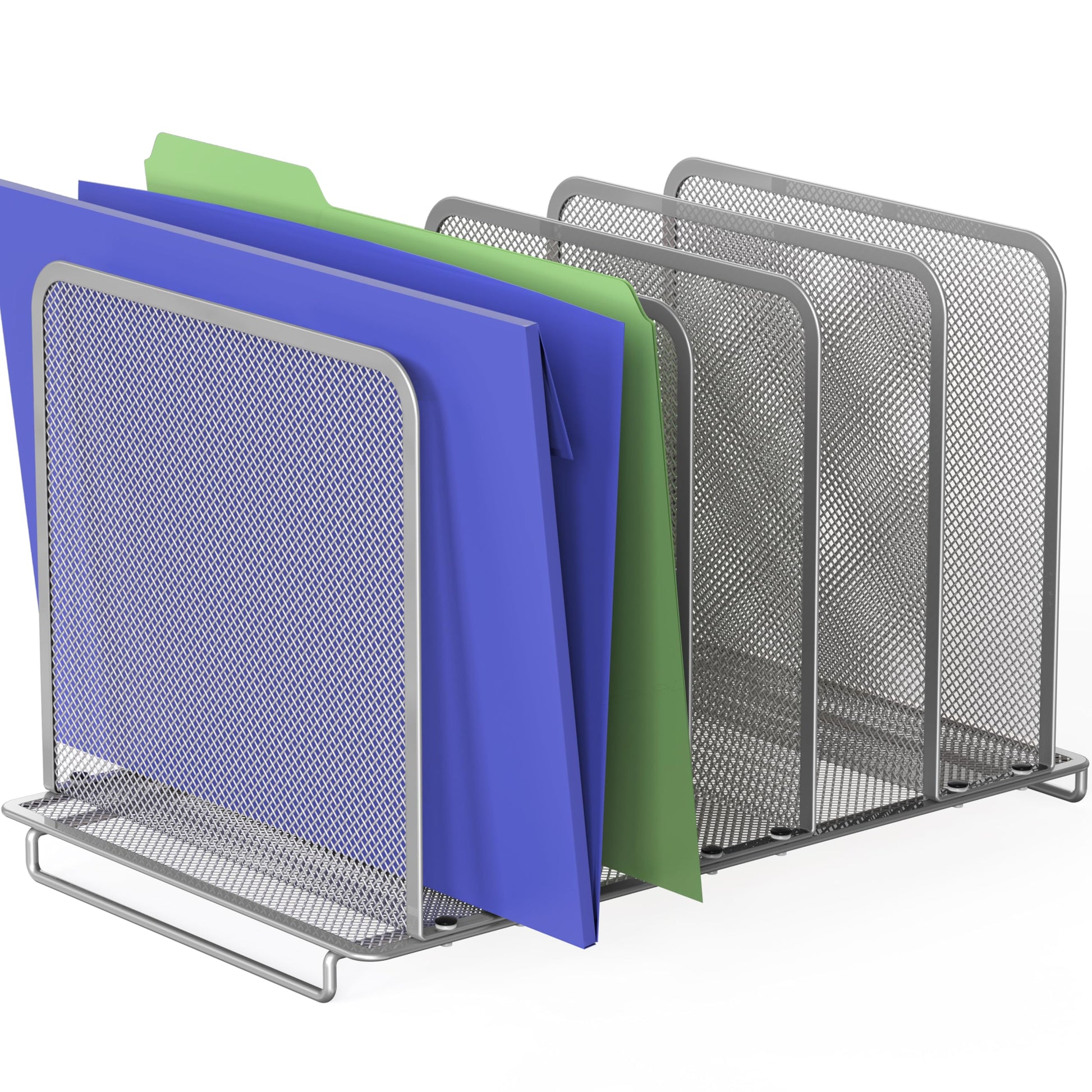 Upright Sections : Vertical compartments keep file holders upright and organized, allowing for easy access to documents. Mesh Material : Constructed with durable metal mesh and sturdy steel for enh
