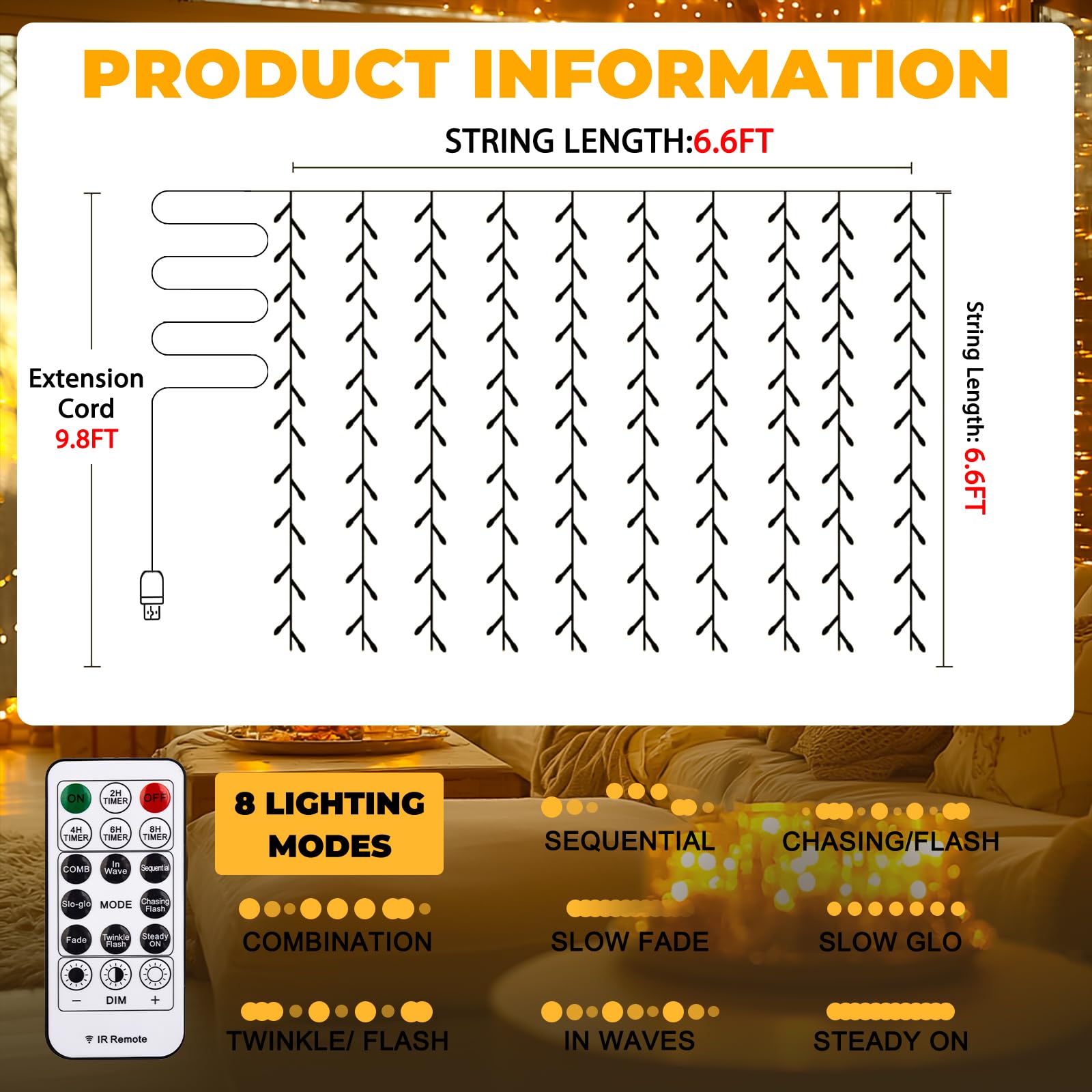 - Tangle-Free Curtain Lights: 200 super bright LED bulbs, the 6.6x6.6Ft curtain lights come with a 9.8Ft extension cord; With 10 drop light strings, each holding 20 LEDs, and convenient hooks at the top for easy hanging, they effortlessly add warmth and sparkle to any room, creating a dreamy, fairytale ambiance that fills your space with joy and serenity