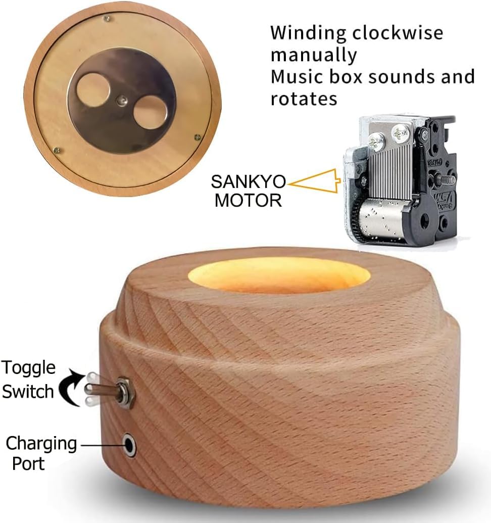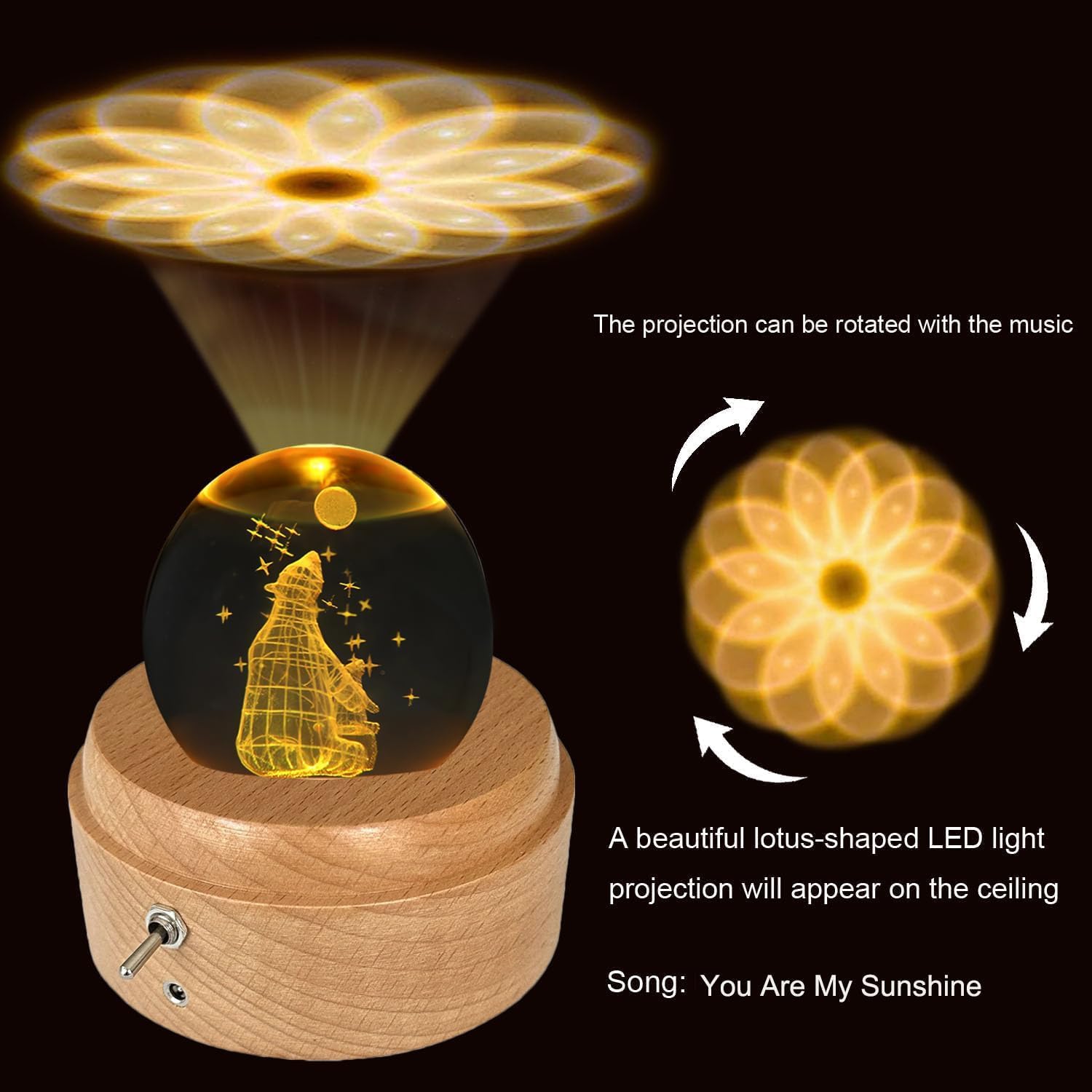 - Beautiful Projection Rotating Music Box - Our music box is high-quality movement inside, quality made, pure sound, no noise, Rotate the clockwork at the bottom of the base and the music of the 'U R My Sunshine' will sound, our song can match the 3D image of crystal ball. The base can rotate while music plays, turn on the switch, a beautiful lotus-shaped light projection will appear on the ceiling, the projection will also rotate.Note that charging for 2-3 hours can turn on the light for 10 hours.