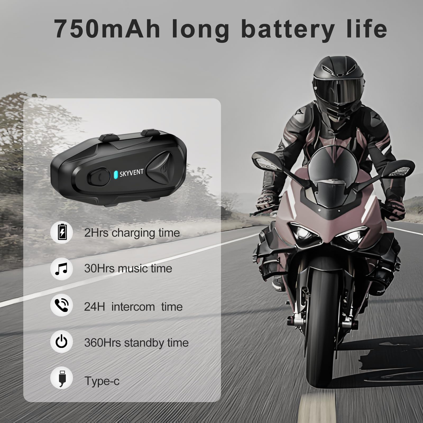 - 【750mAh Battery & IP65 Waterproof】Powered by a 750mAh battery, it provides an outstanding 24 hours of continuous talk time and 30 hours of music playback. That's more than enough power for a full day of motorbike riding. With IP65 waterproof and dustproof capabilities, it can withstand rain, sweat, and splashes, ensuring reliable performance in any weather.