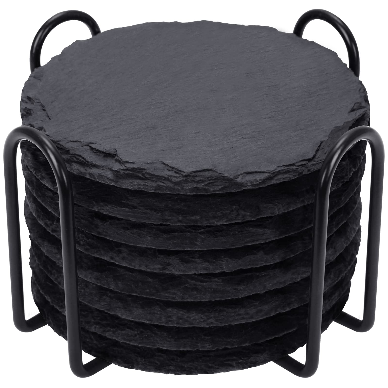 Slate Drink Coasters with Metal Holder, GOH DODD Set of 8 Black Coasters, 4 Inch Stone Coaster Set Tabletop Protection for Home Kitchen Apartment Bar Decor Housewarming Gifts Wedding Party, Round