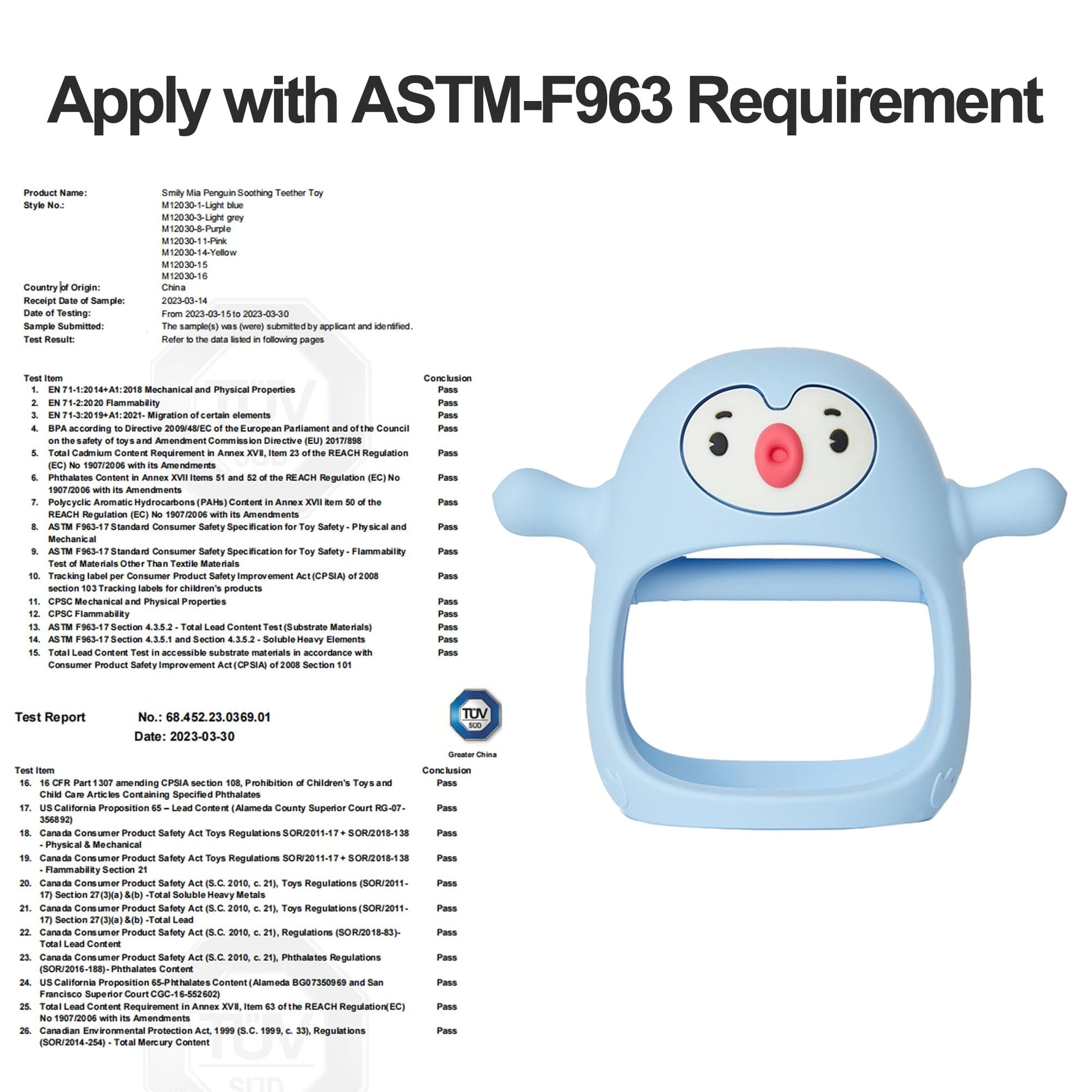 - ✅Safety is Our #1 Priority at Smily Mia: All of our silicone teethers are crafted from Medical-Grade silicone, ensuring the highest safety standards. (See below for tips on how to distinguish food-grade silicone from other materials.) Our products are free from BPA, PVC, Lead, and Phthalates. Each teether is made by an FDA-verified manufacturer to guarantee quality. The nipple on the Penguin Teether is thicker than other brands to ensure that babies with teeth cannot bite through it.
