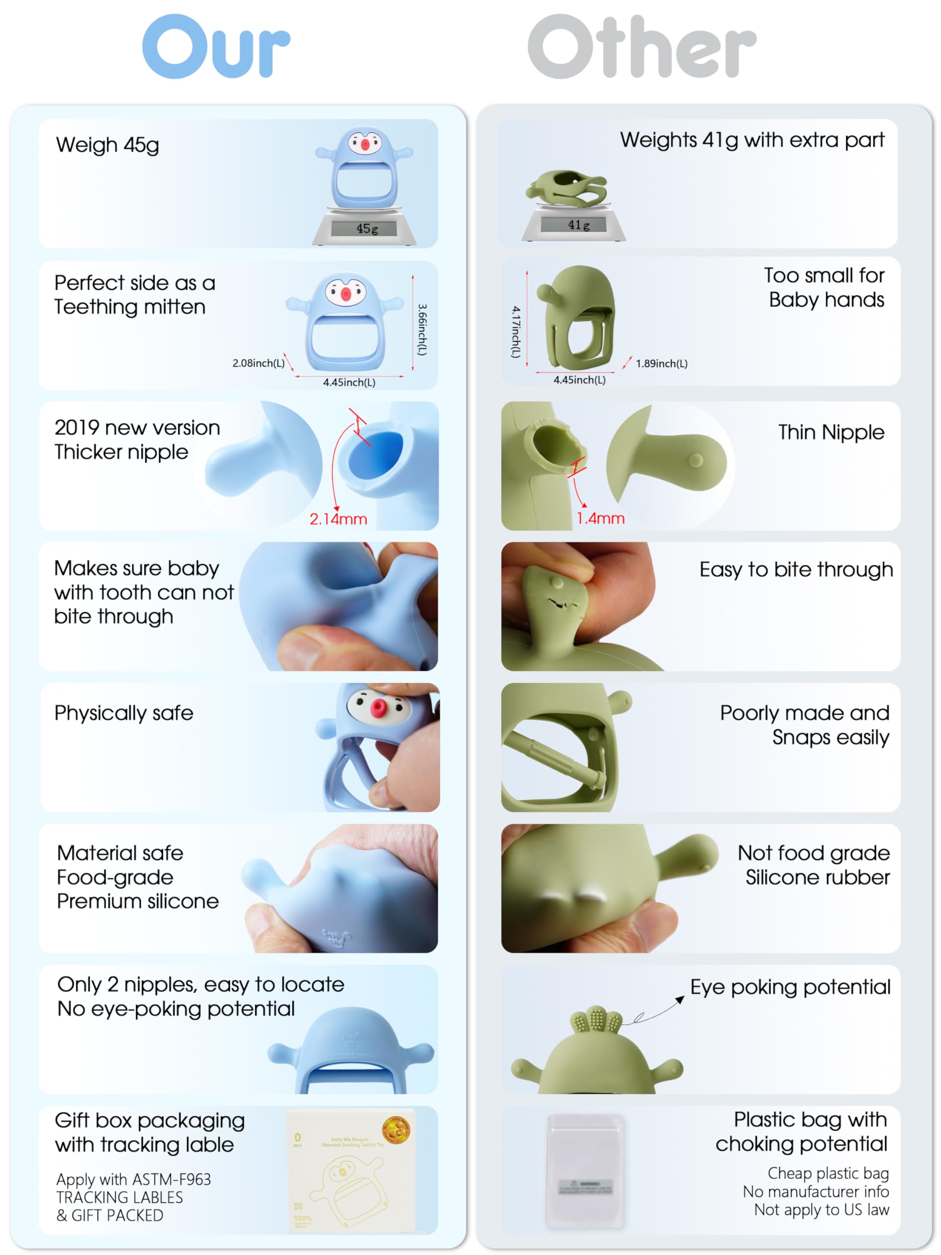 - 【BEST TEETHER FOR 3-6MONTHS BABIES】:For 0-6Months babies, sucking is calming. At the same time, baby start teething around 3Months old. This penguin teether is designed for sucking with the shape to mimic natural latch feelings, works as a pacifier. At teh same time, our PACIFIER part is MUCH THICKER than other soothers, which is more chewy and durable for baby to rubbling and massaging sore gum from constantly pulling the teether for early teething pain relief. Its thick and chewy nipple part makes sure it is safe for 6-12months babies with tooth to chew on it.