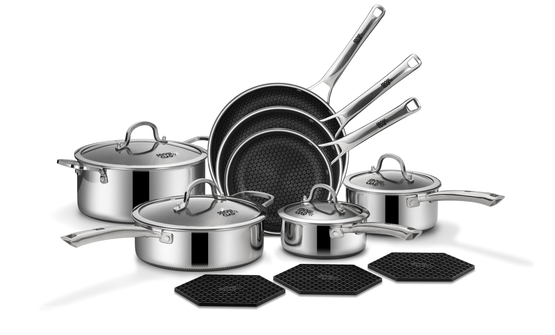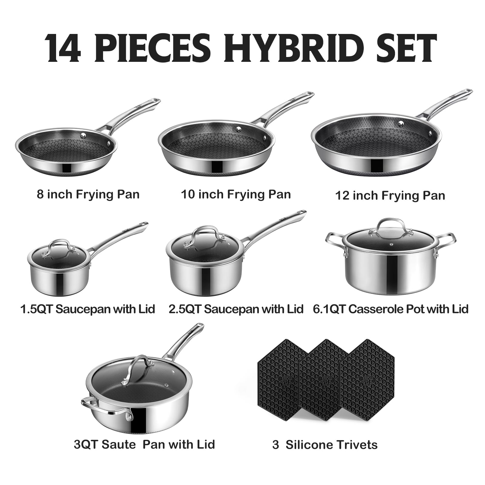 - [SPECIALITY] SNOWCLAD 14-Piece Induction Cookware Set Includes :8In &10In &12In Frying Pans, 1.5 QT & 2.5QT Saucepan with Lid, 6.1QT Casserole Pot with Lid, 3.6QT Saute Pan with Lid, and 3 Silicone Trivets. Our favorite non stick pots and pans set meets all your need for every day cooking.