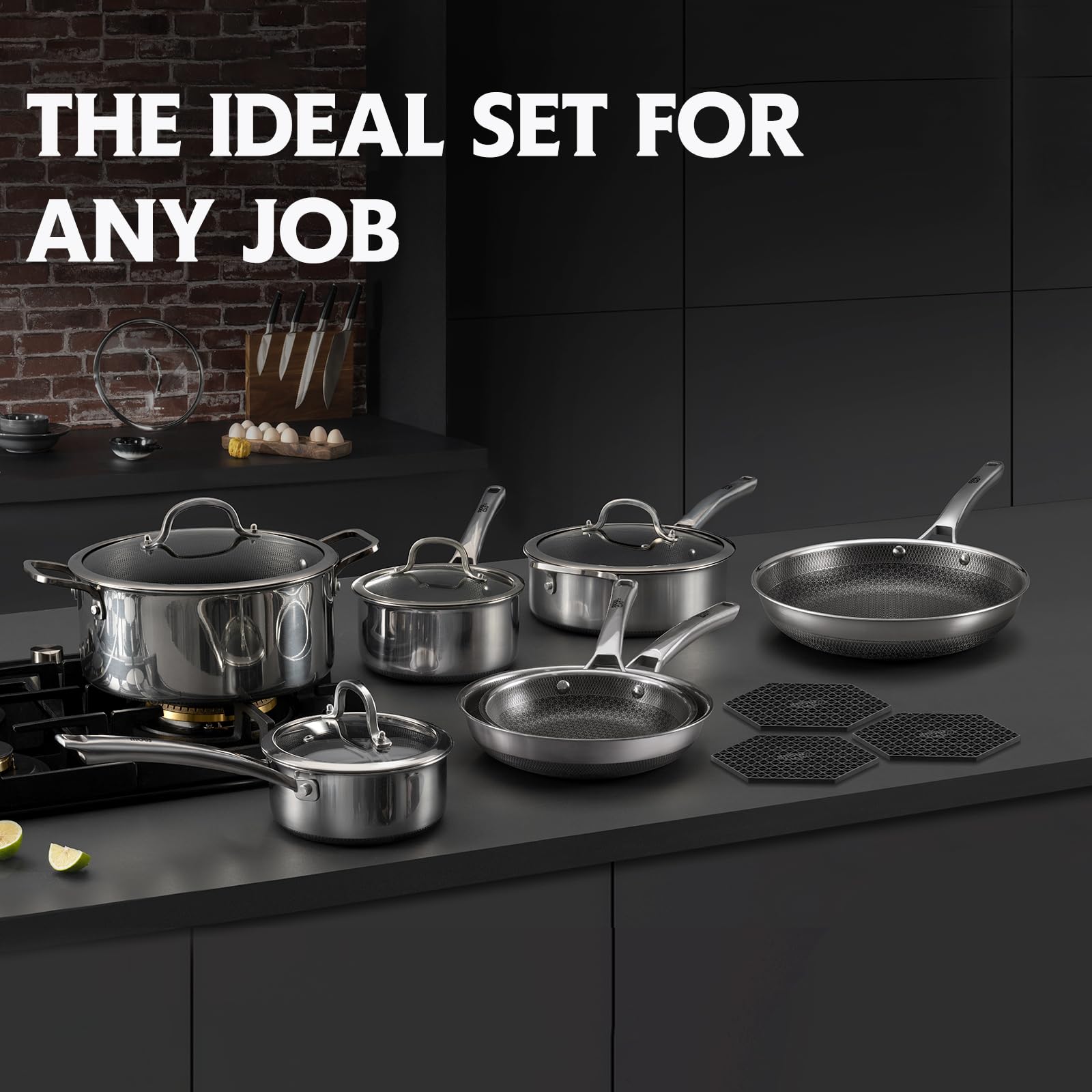 SNOWCLAD Pots and Pans Set Non Stick, 14 Pcs Hybrid Stainless Steel Cookware Sets, Non Stick Frying Pans, Saucepans, Saute Pan & Stock Pot, PFOA Free Kitchen Skillet,Induction Compatible