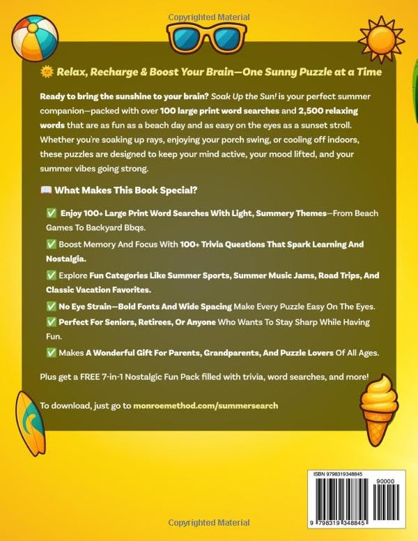 Whether you're lounging poolside, sitting on your porch swing, or simply dreaming of sunshine, this book is your invitation to slow down, smile, and stay sharp. With fun trivia questions, seasonal themes, and extra-large print for easy reading, it’s perfect for seniors, adults, and anyone who loves a little sunshine with their puzzles. 📖 What Makes This Book Special?