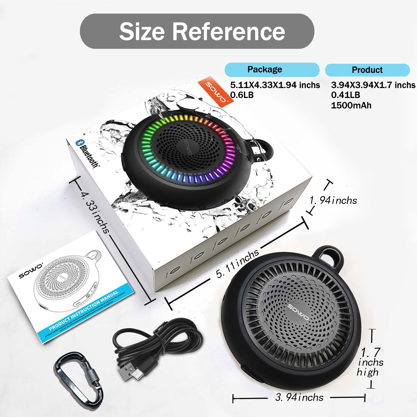 SOWO Bluetooth Shower Speaker Waterproof | Small Portable Bluetooth Speaker Wireless with Clip | Powerful Bass and Louder Volume | Colorful Lights and Lightweight | with TWS Pairing | Black