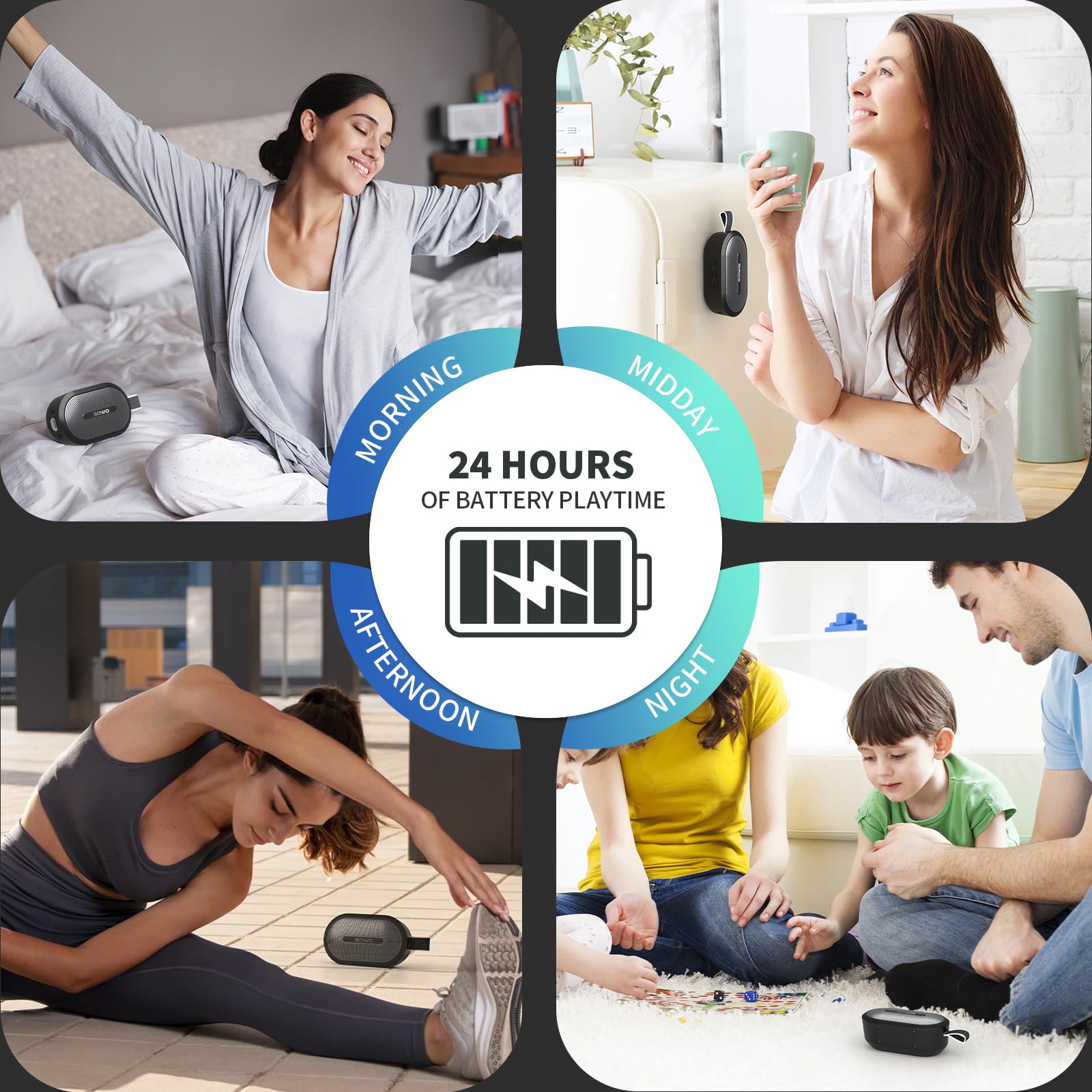 - Magnetic & Clip on Bluetooth Speaker: The Portable Bluetooth Speaker is compact enough to be operated with one hand and easy to carry, You can enjoy music while hiking, cycling, playing golf outdoors or yoga, cooking,kitchen,watching mobile videos indoors