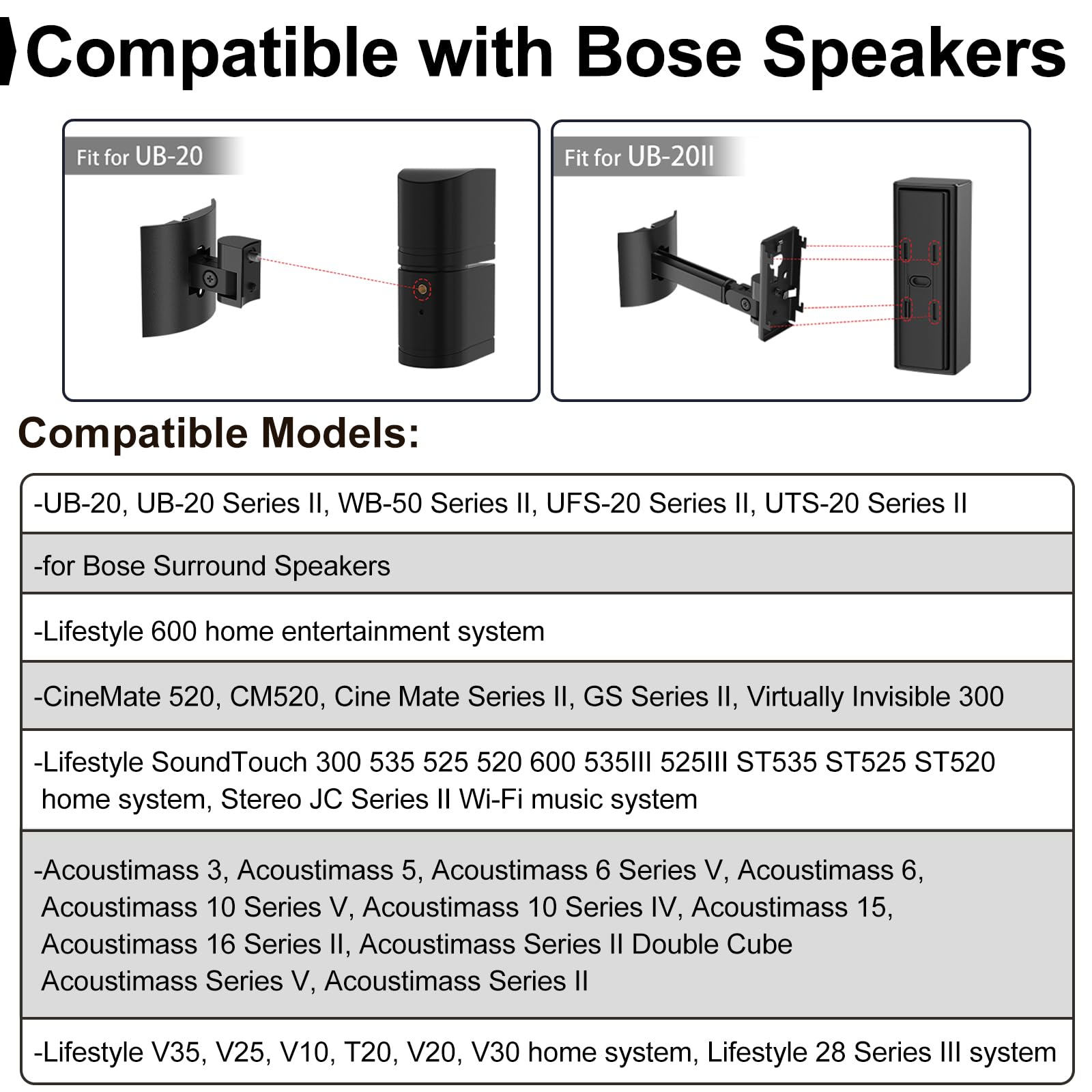 - ----Compatible---- Ceiling mount & wall mount bracket for Bose UB-20, UB-20 Series II, WB-50 Series II, UFS-20 Series II, UTS-20 Series II - For Bose Surround Speakers, Lifestyle 600 home entertainment system - For CineMate 520, CM520, Cine Mate Series II, GS Series II, Virtually Invisible 300 - For Lifestyle SoundTouch 300 535 525 520 600 535III 525III ST535 ST525 ST520 home system, Stereo JC Series II Wi-Fi music system