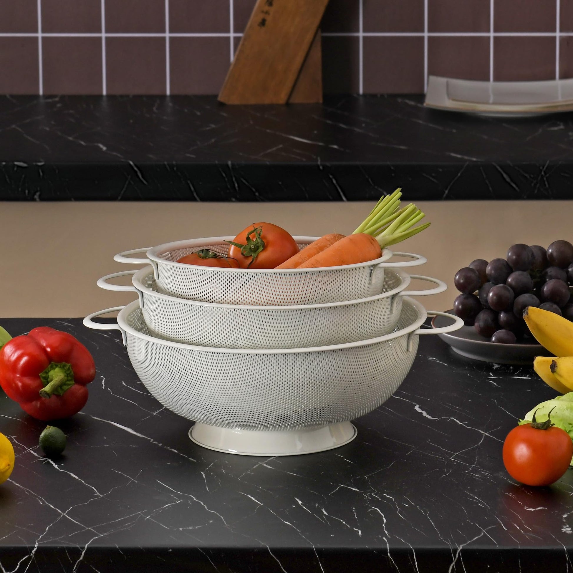 Stainless Steel Colander 3 Piece,Metal Strainer Basket with Solid Base and Handles for Kitchen Food,Pasta, Noodles, Vegetables and Fruits,Powder Coated,BPA Free,Dishwasher Safe,2 & 3 & 4.5 Qt (Cream)
