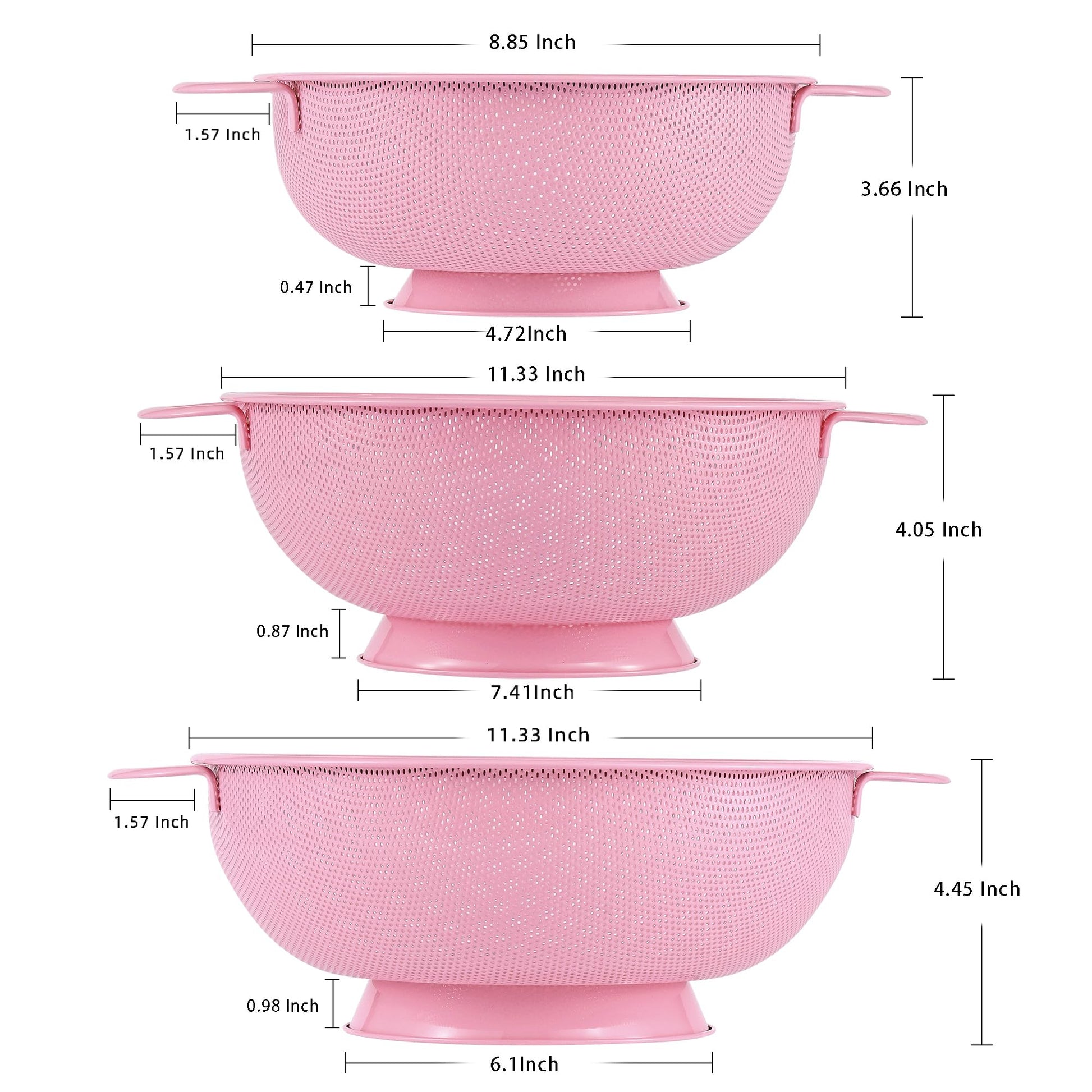 Stainless Steel Colander 3 Piece,Metal Strainer Basket with Solid Base and Handles for Kitchen Food,Pasta, Noodles, Vegetables and Fruits,Powder Coated,BPA Free,Dishwasher Safe,2 & 3 & 4.5 Qt (Pink)