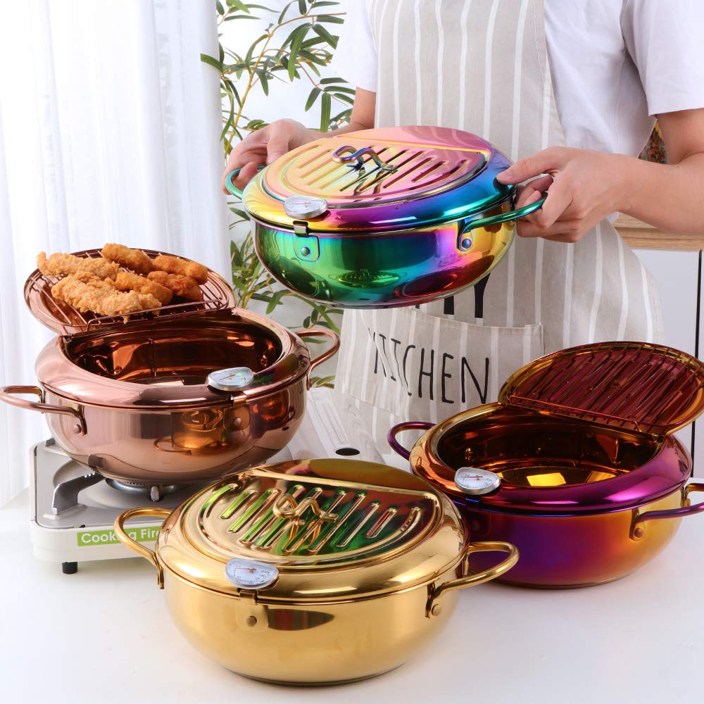 Stainless Steel Deep Fryer for Home, 115Oz Tempura Fryer Pot w/Thermometer and Oil Drip Rack Lid, Japanese Style Deep Frying Pan w/Strainer Clip, for Tempura chips, Fish, and Chicken (Rainbow Color)