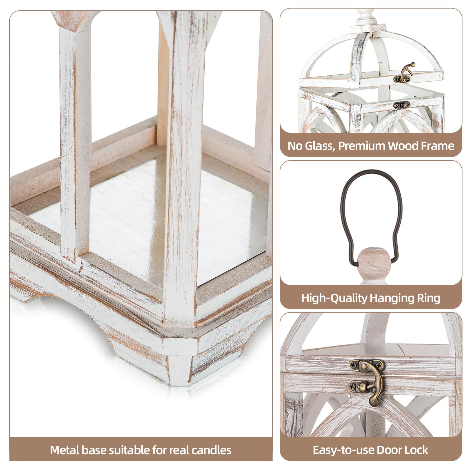 - Farmhouse Decor: Upgrade your space with a farmhouse touch using a washwhite wooden frame. The lantern's unique design enhances your living, dining, or outdoor areas, complementing various decor styles. Perfect for you or as a gift for friends!