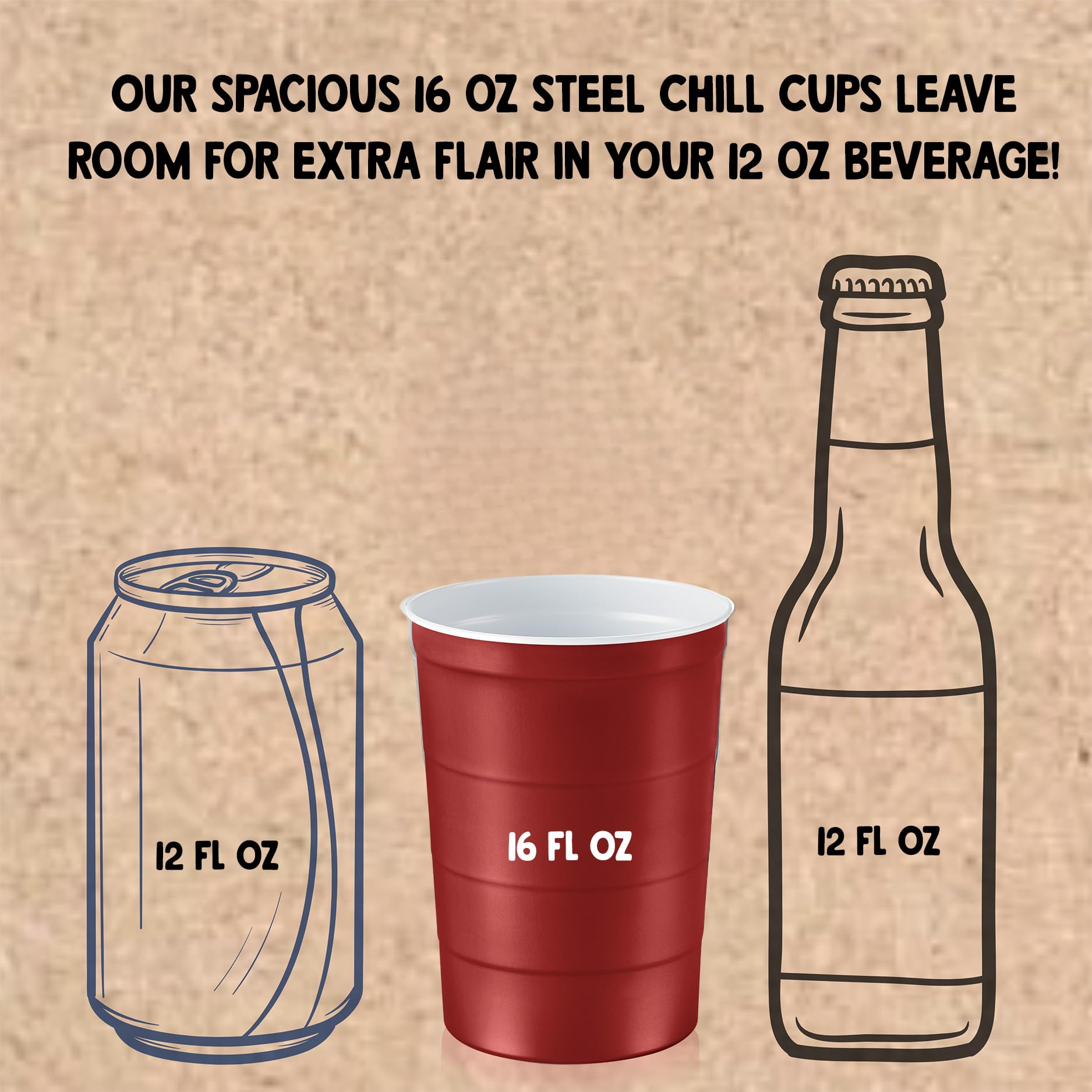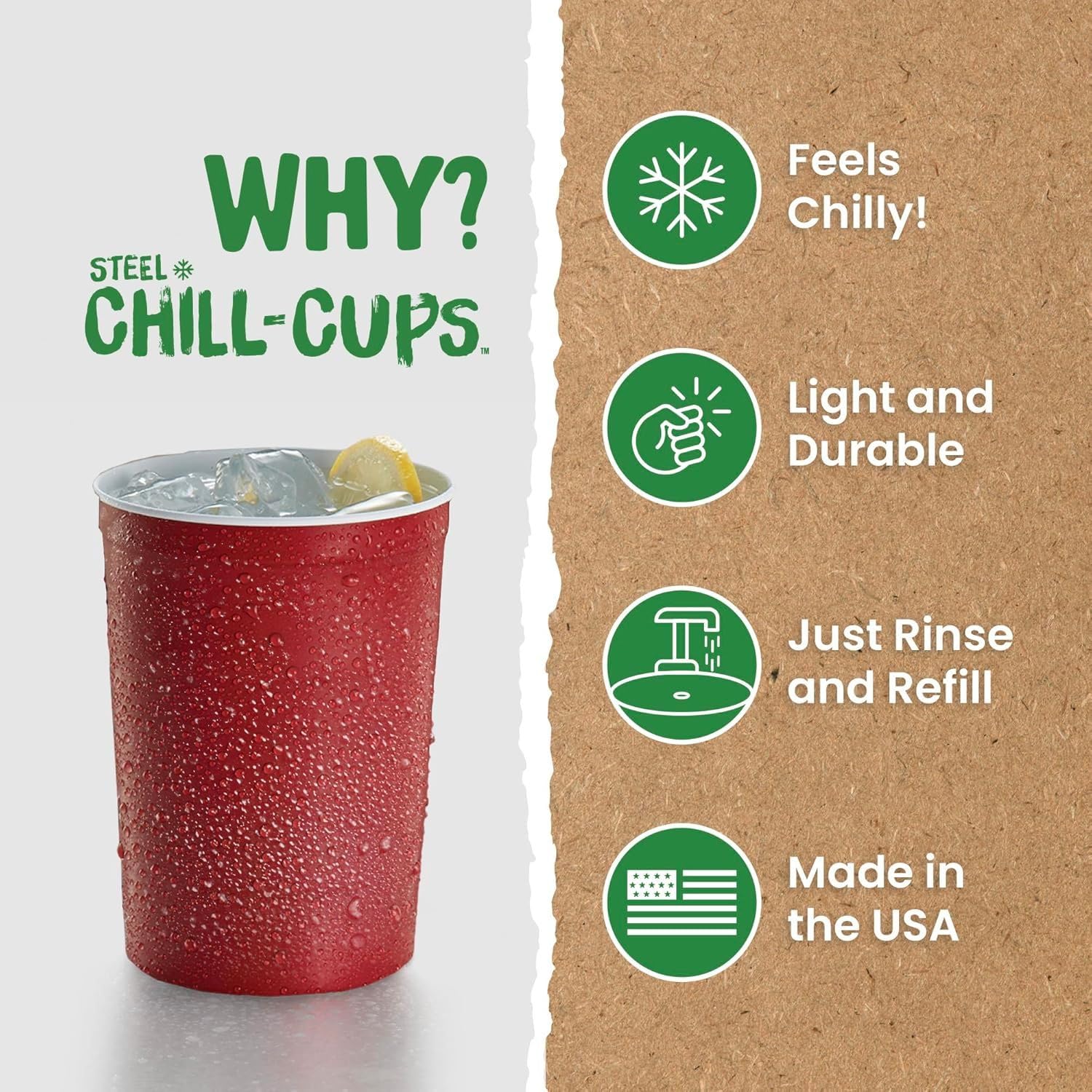 Steel Chill Cups 16 oz. Party Cups, Perfect for Cold Drinks, Sturdy & Durable, Disposable and 100% Recyclable, Made in USA, Red, 12 Count