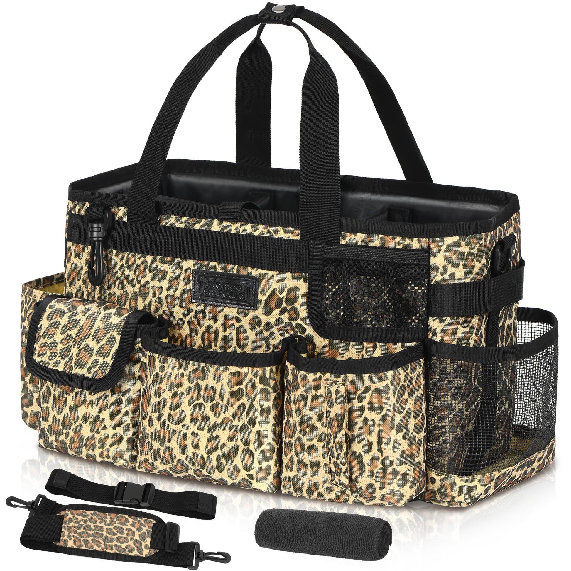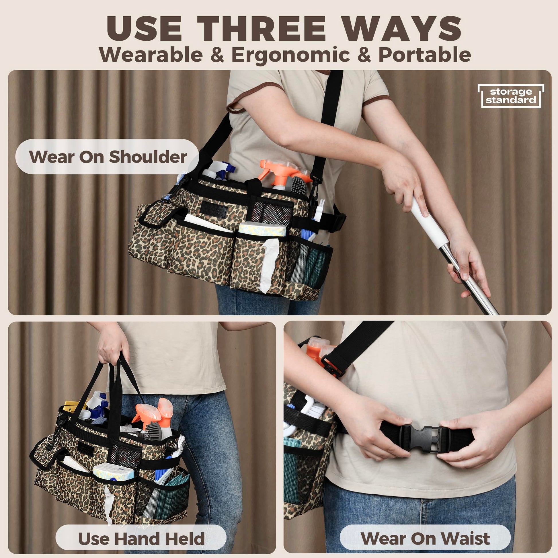 Storage Standard Cleaning Caddy Organizer with Handle - Small Cleaning Caddy Supplies Bag with Shoulder & Waist Strap - Cleaning Supplies Organizer with Cleaning Cloth - Leopard