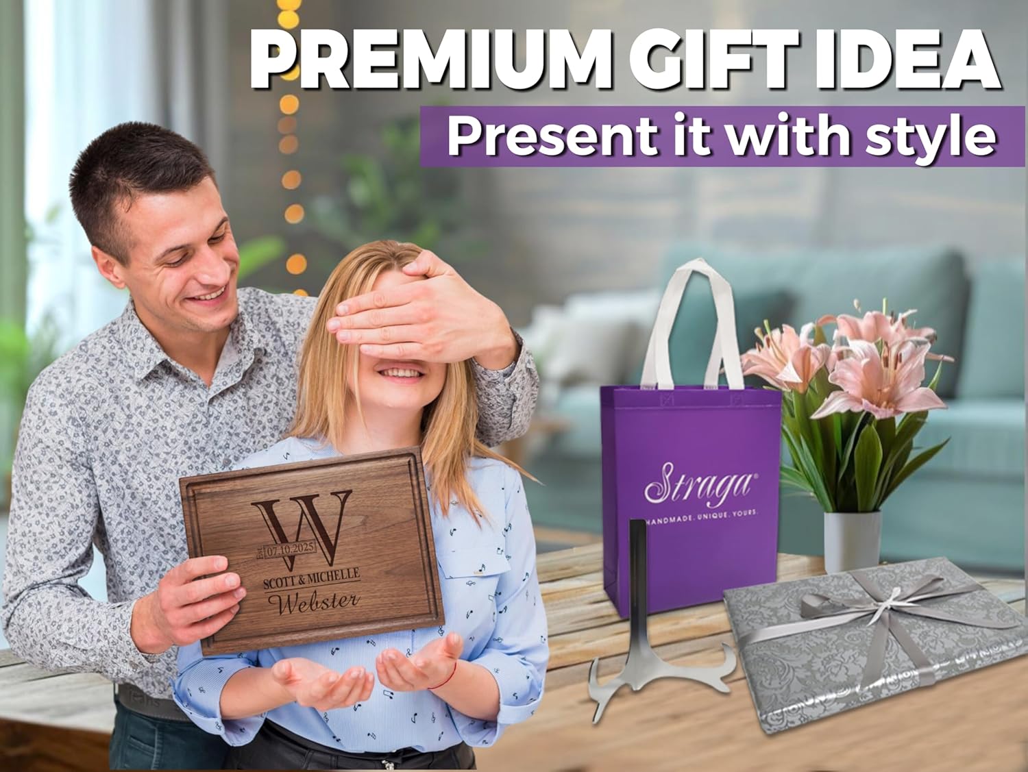 Straga Personalized Cutting Boards | Handmade Wood Engraved Charcuterie | Custom Wedding Gift, Housewarming Gift for Couples Monogram Designs 003
