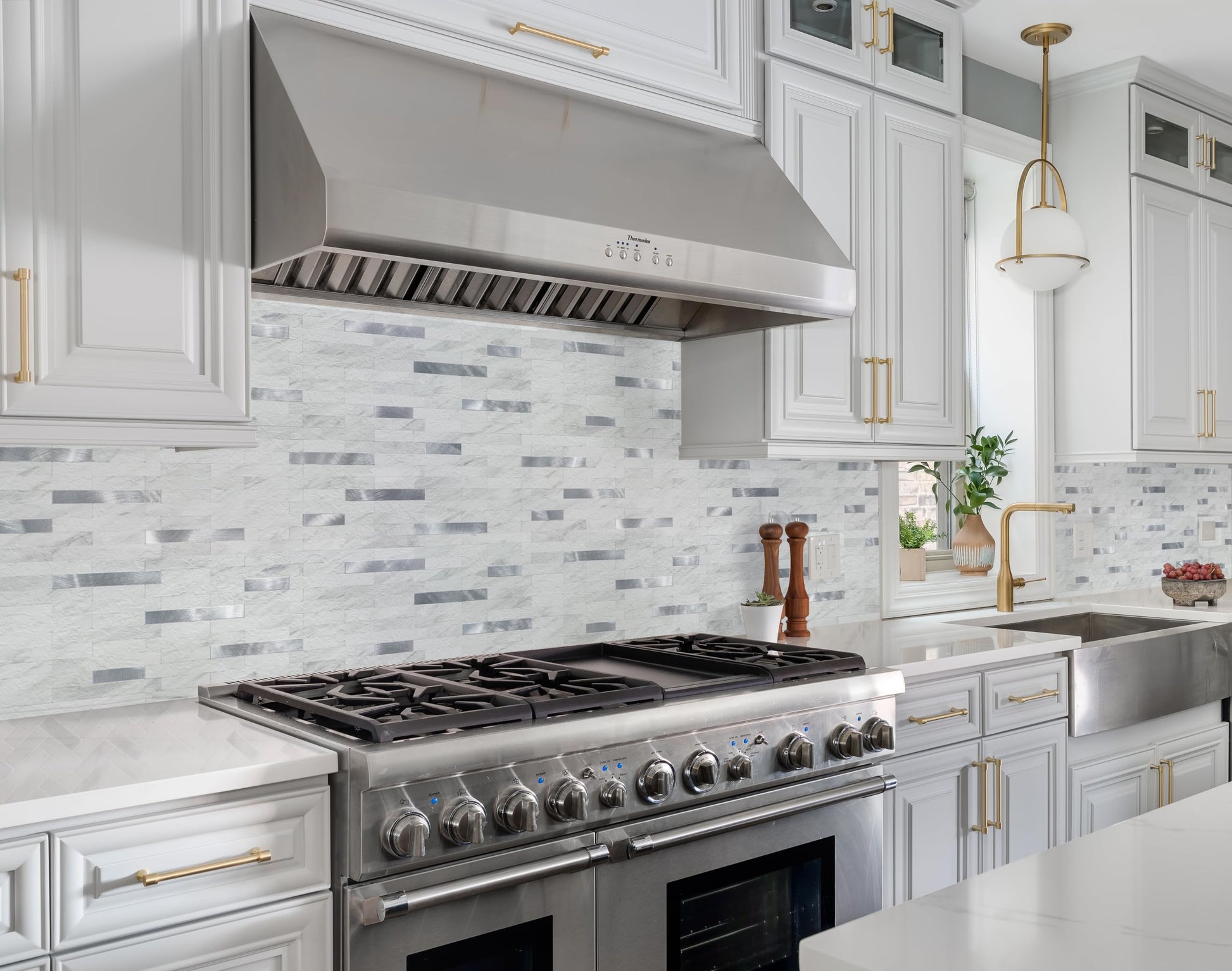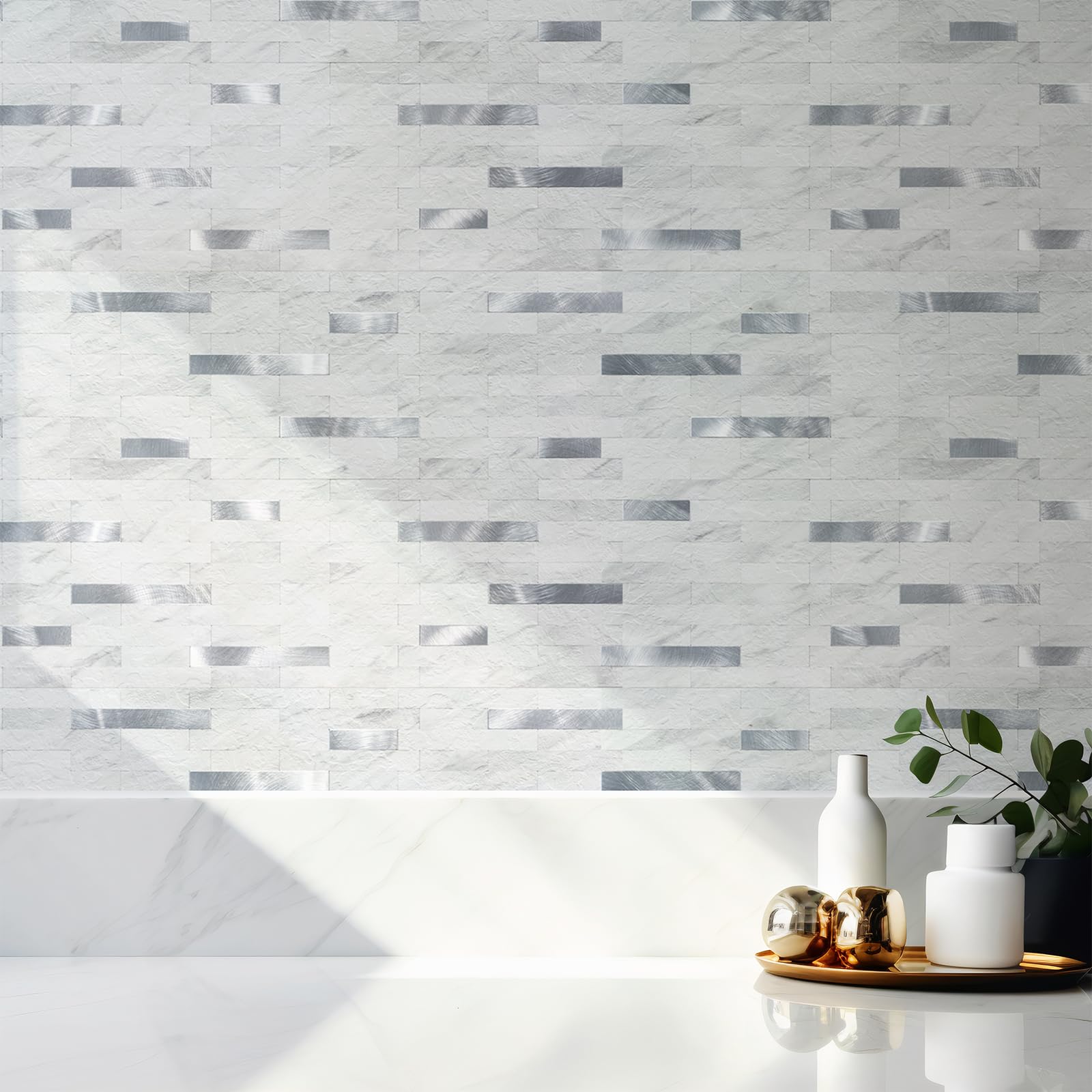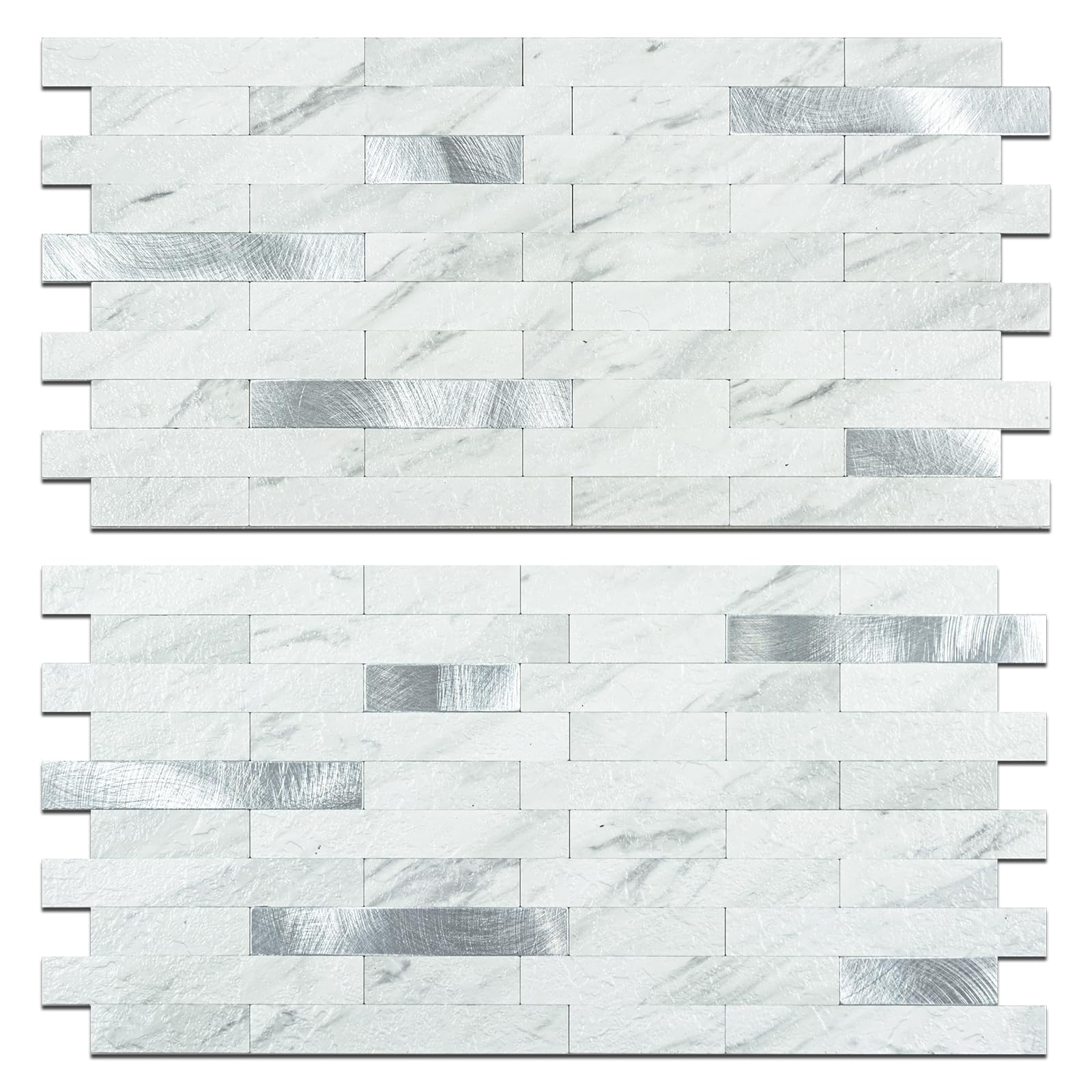 StyloVue 2 Sheets Peel and Stick Backsplash for Kitchen, White Marble with Metal Silver Look Stick on Tile Upgrade Your Kitchen Backsplash, RV, Fireplace