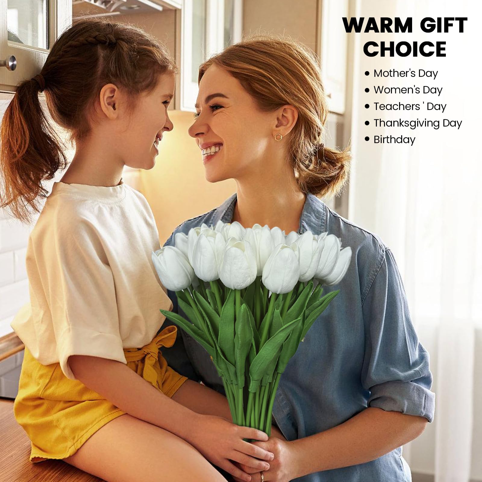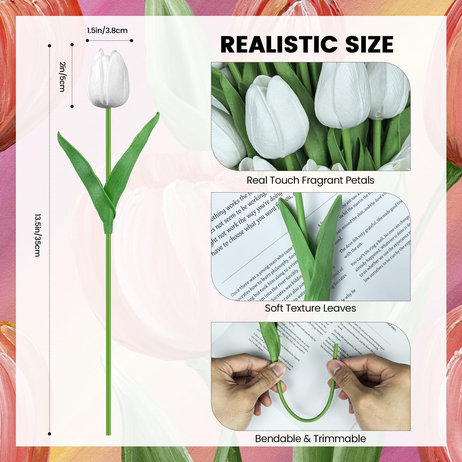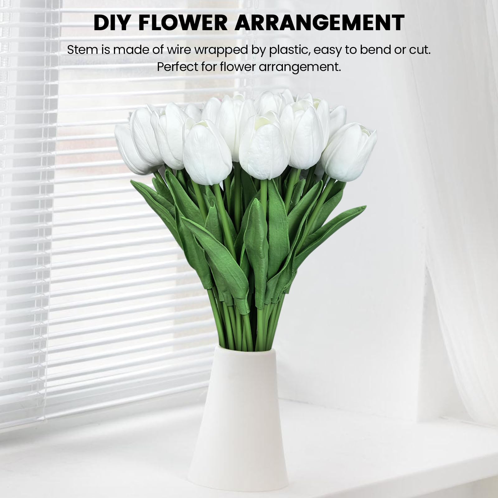 Subacy 30 PCS Artificial Tulips 13.5inch Long Fake Flowers Real Touch Tulips Silk Flowers for Spring Easter Mother's Day Decorations (White)