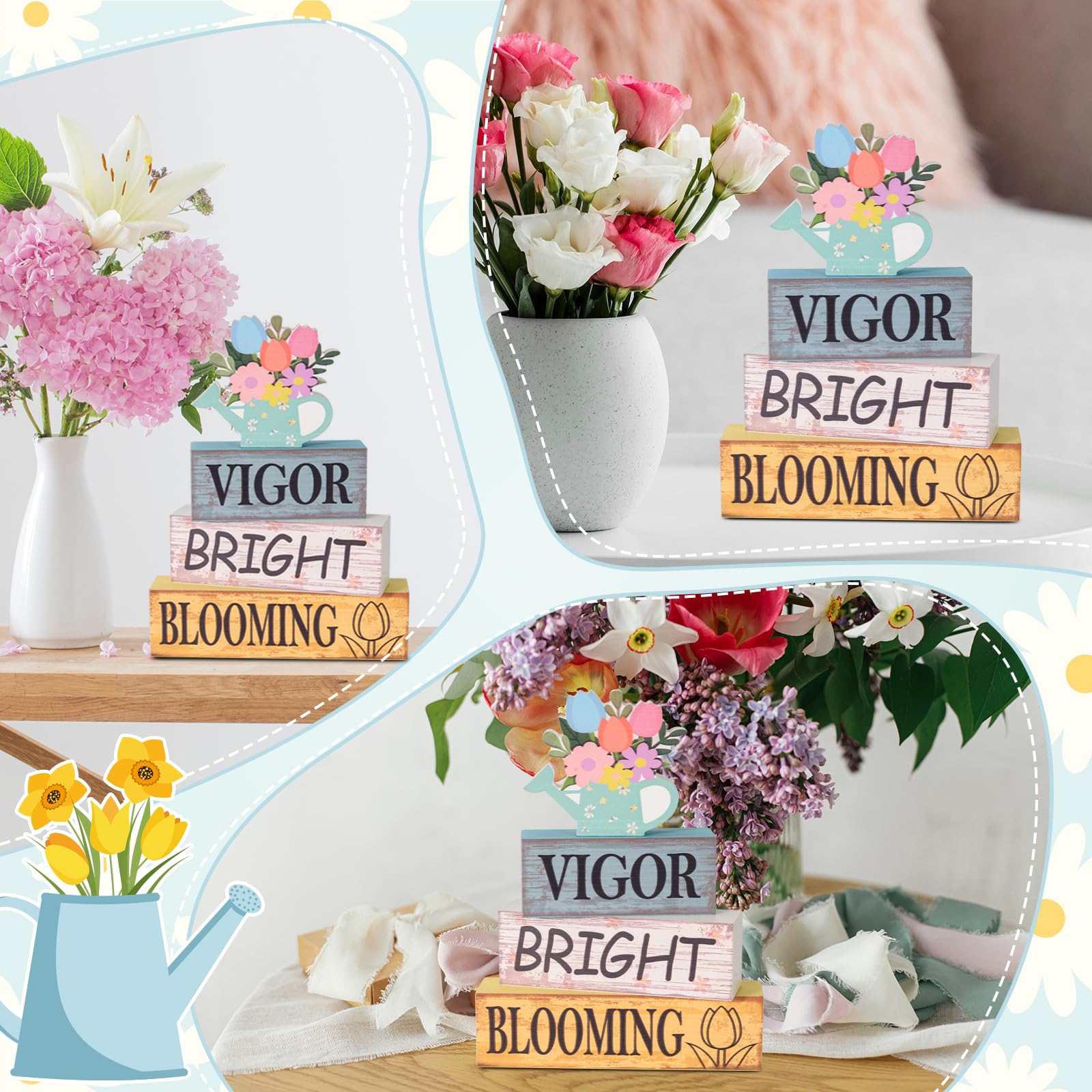 Summer Tiered Tray Decor Wooden Flower Kettle Block Signs Spring Wood Flower Block Summer Tiered Tray Decorations Vigor Bright Blooming Centerpiece Decorations for Kitchen Home Shelf Office Decor