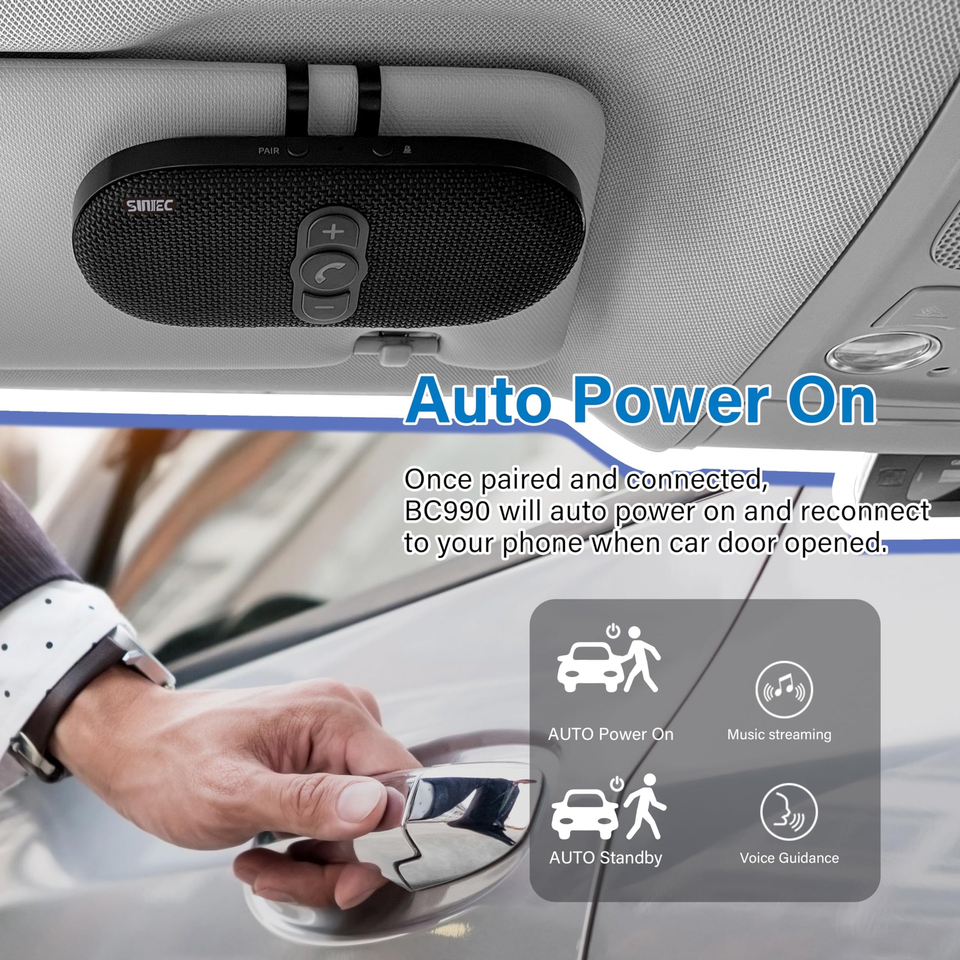 - CAR SPEAKER AUTO ON OFF - BC990P hands free bluetooth car kit will auto POWER off into SLEEP mode when bluetooth out of range 10meter, and AWAKE/Auto Power ON by any vibration like open car door then searching knows phone to connect.