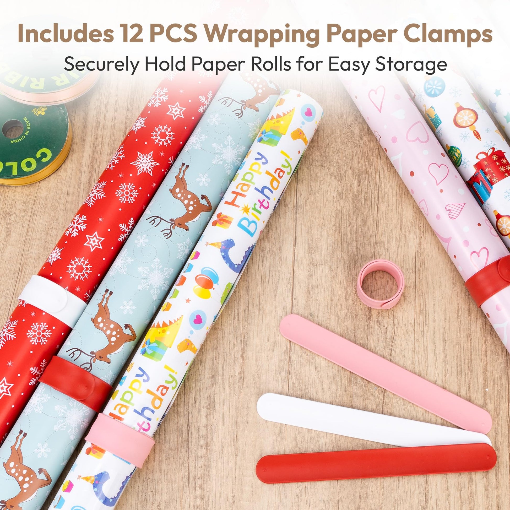 - 【12 PCS Silicone Slap Bracelets】Comes with 12 pcs silicone wrapping paper clamps in three colors (red, pink, and white). Simply pat the paper clip to form a secure circle around the wrapping paper roll, which keeps the roll in place and protected. You can easily slide them on and off the roll, which saves your time and avoids paper ripping, and no longer need to tape the end of the roll