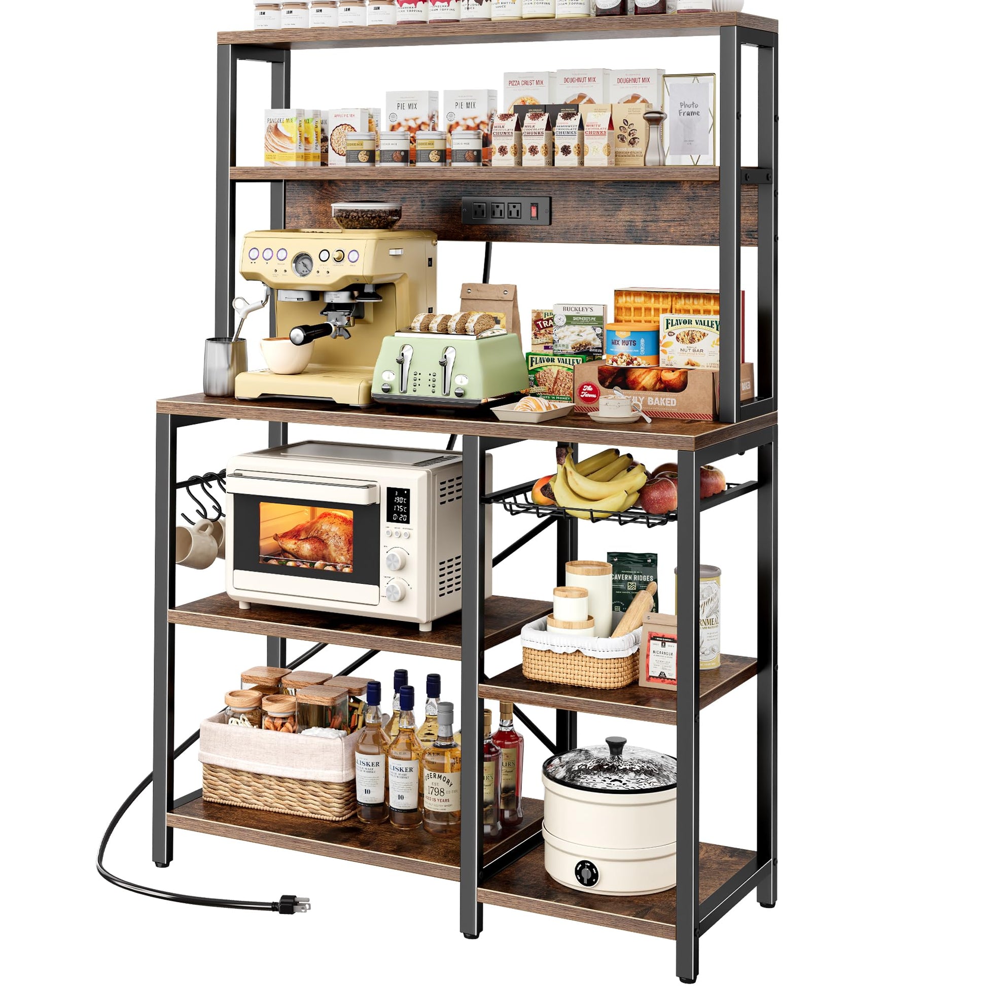 SUPERJARE Bakers Rack with Power Outlet, 35.4 Inches Coffee Bar with Wire Basket, Kitchen Microwave Stand with 6 S-Shaped Hooks, Open Storage Shelves, Rustic Brown