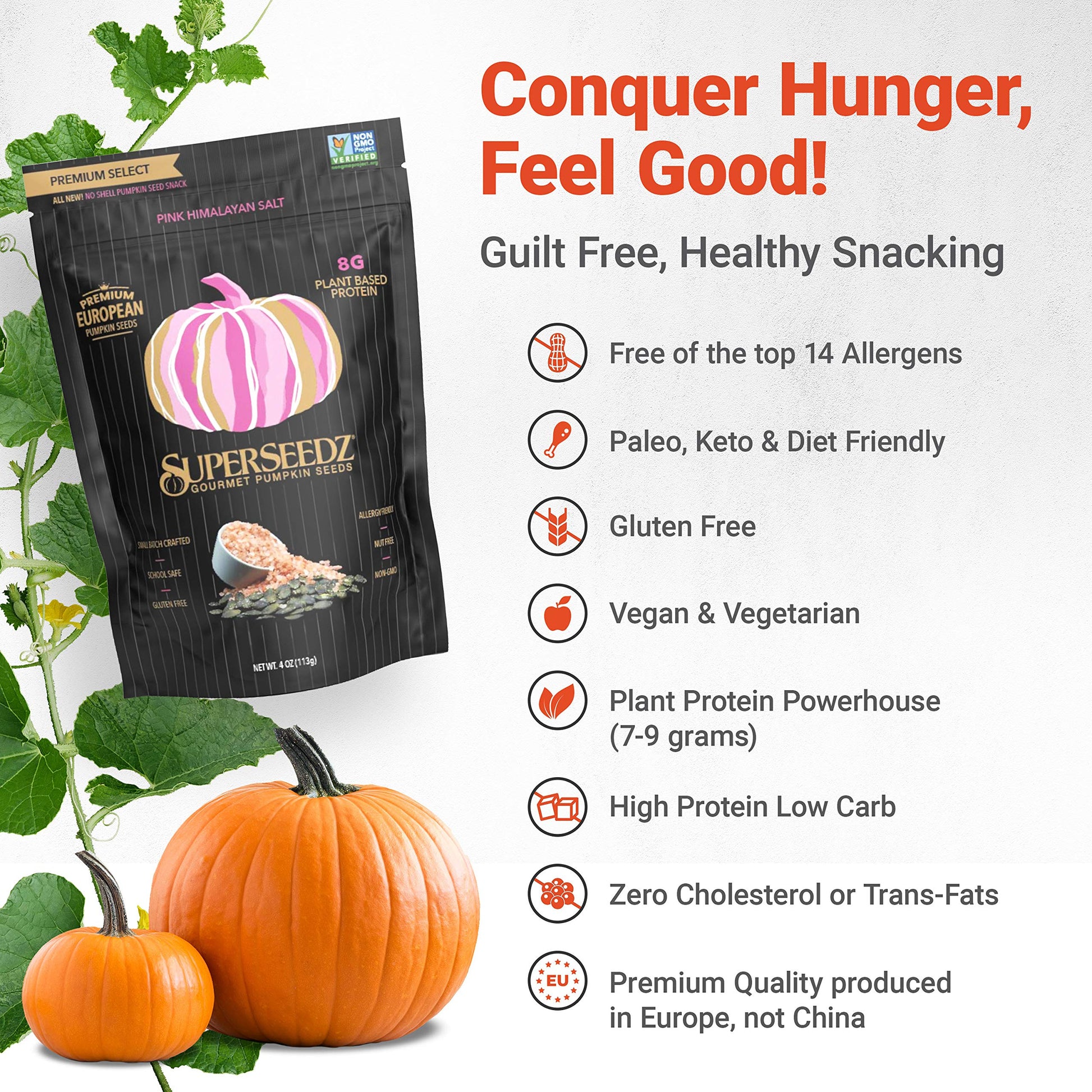 - Simply Delicious > Each premium pumpkin seed kernel has a superfine pink salt coating that has just the right amount of salt and crunch. They're bigger, tastier, and more snackable than ever. We call it snacking nirvana…enjoy! Seedz the Day with SuperSeedz!