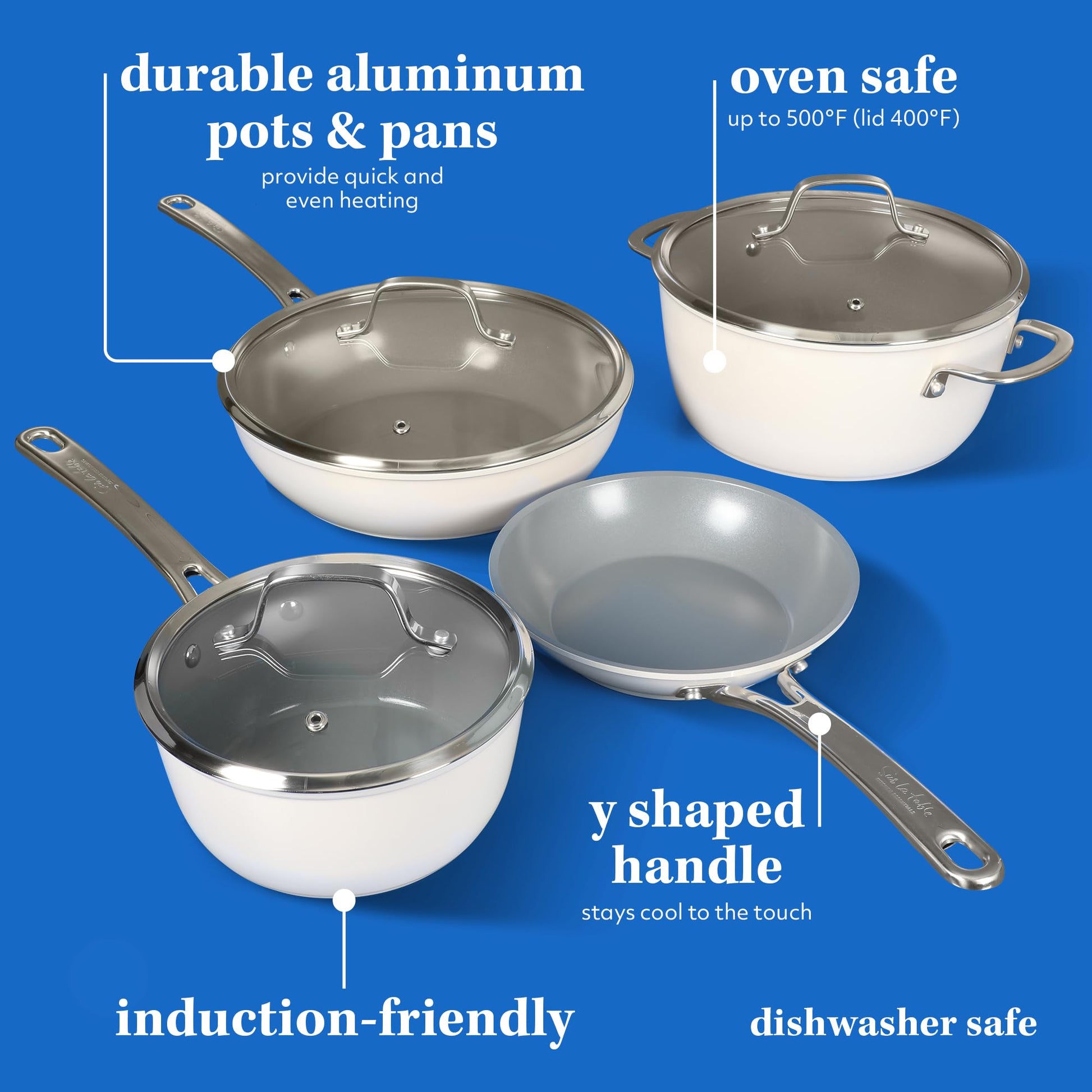 Sur La Table Kitchen Essentials 10 Piece PFA Free Non-Toxic Titanium Ceramic Nonstick Interior Forged Aluminum Cookware Pots and Pans Set - Linen White - Induction Compatible