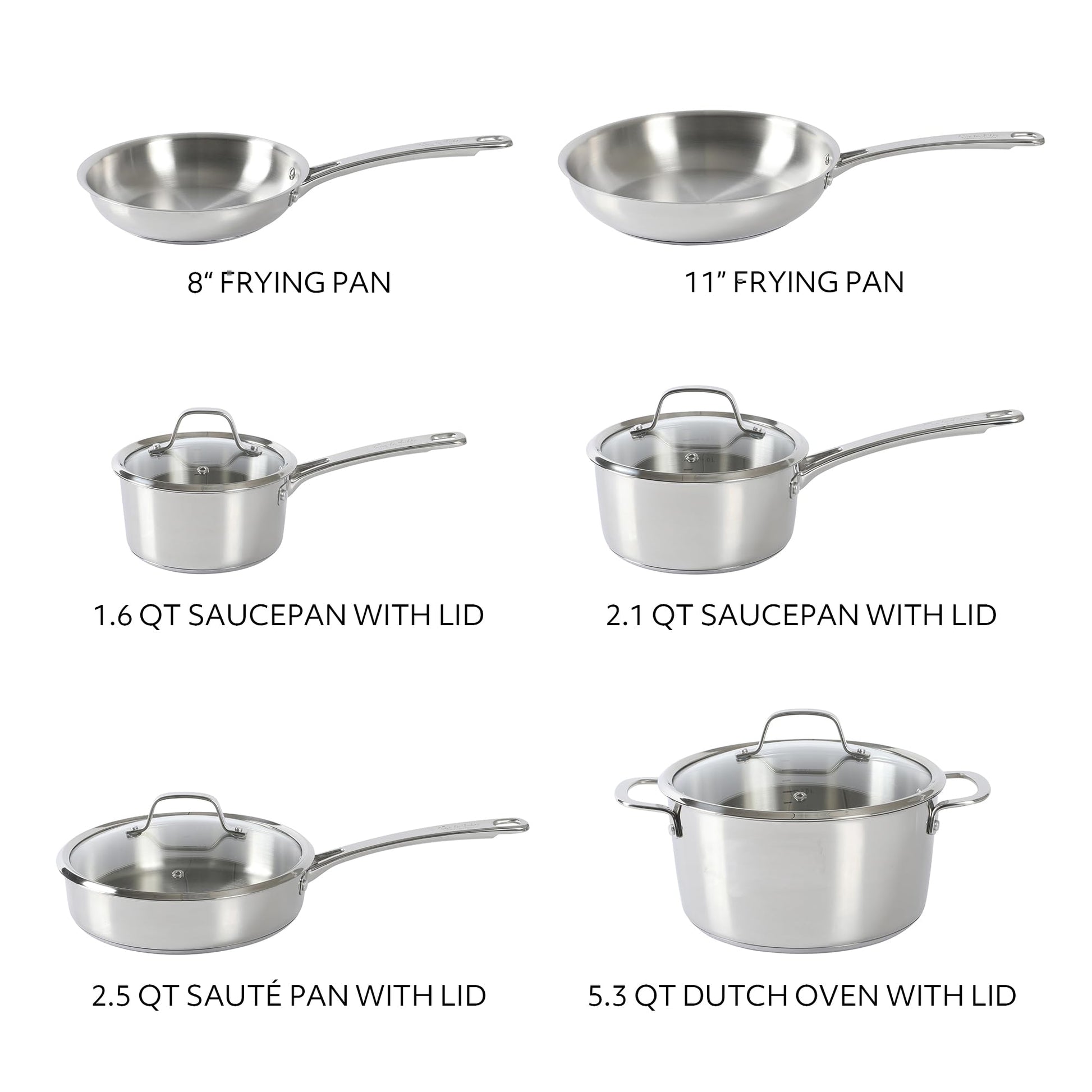 - STAINLESS STEEL COOKWARE: mirror-polish stainless steel pots and pans are built to last to keep up with serving happy and homemade meals every day. each piece features an aluminum base that absorbs and distributes heat evenly from any stovetop.