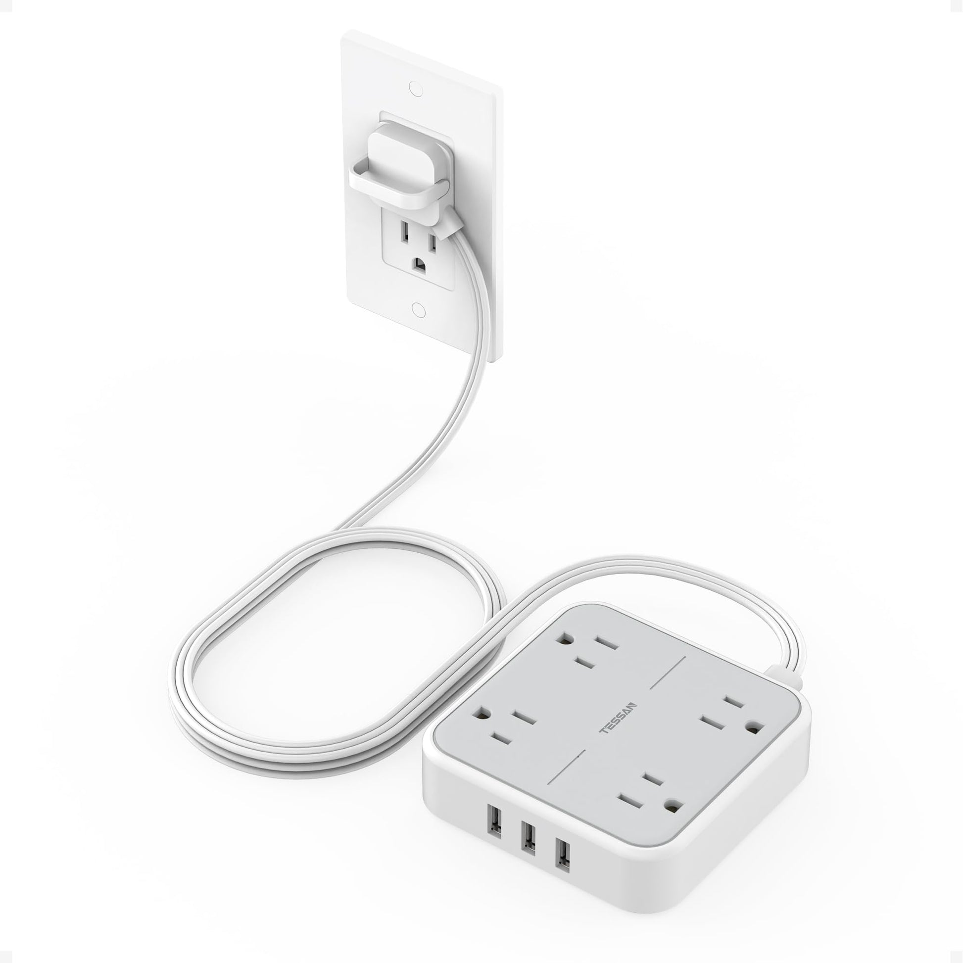 Surge Protector Power Strip, TESSAN Ring Pull Flat Plug Extension Cord 10 Ft with 3 USB (1 USB C) 4 Outlets, 900 Joules Protection, Desktop Charging Station for Home, Office, College, Dorm Room, Gray