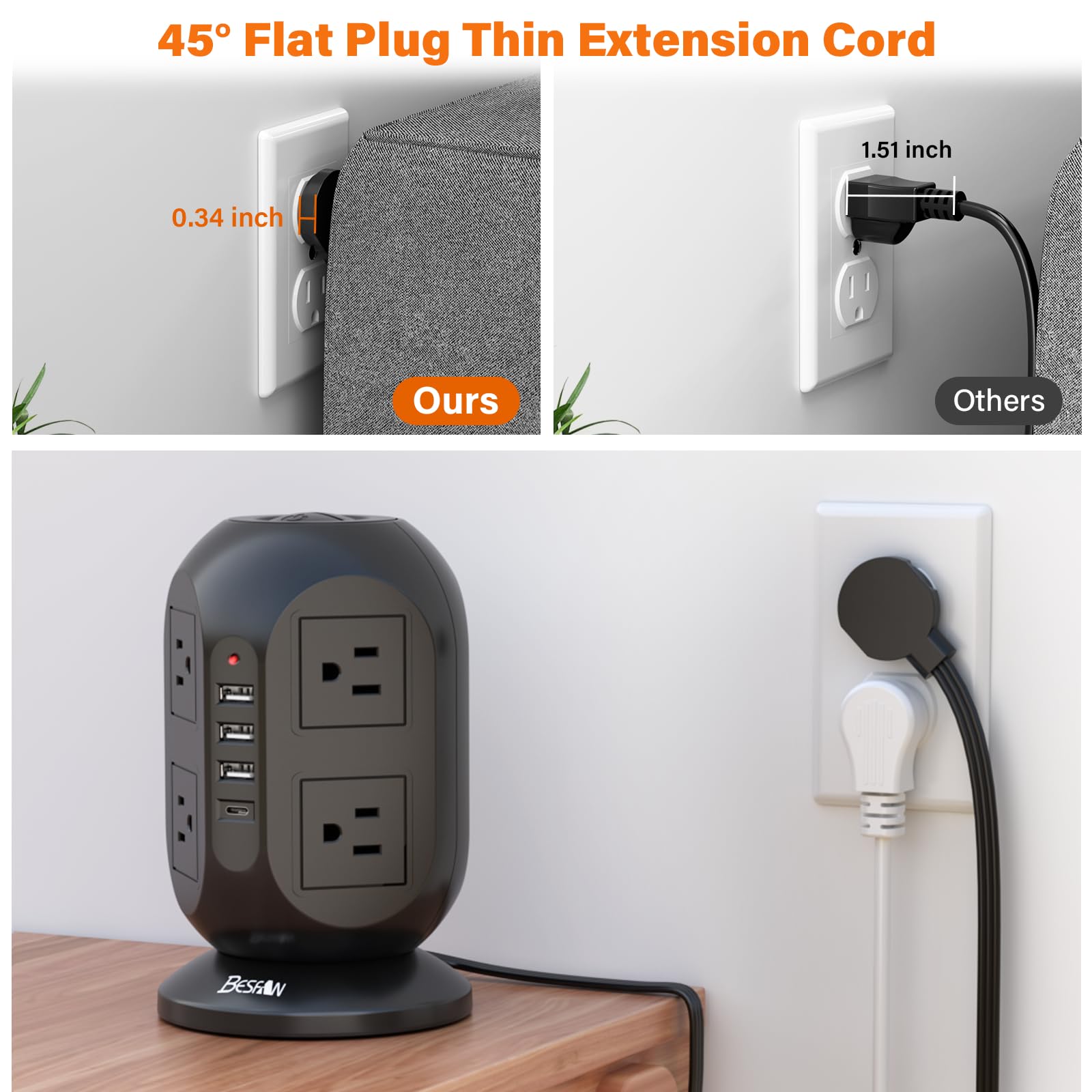 - 12-in-1 Power Tower: This flat plug power strip with usb ports with 8 widely spaced AC outlets and 4 USB ports; The 2.2-inch spacing allows you to connect up to 12 devices simultaneously, accommodating 8 large plugs without blocking each other