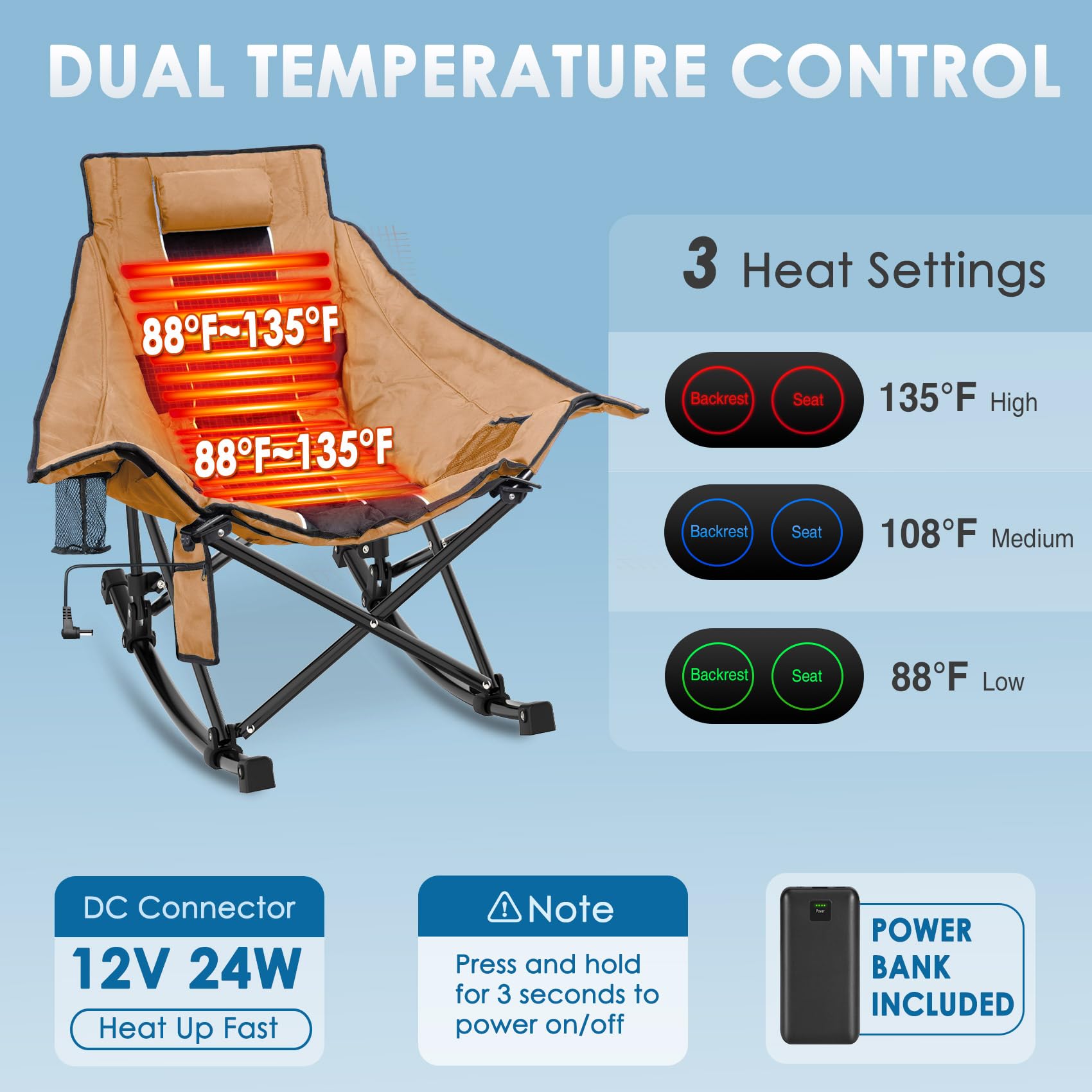 - 【Adjustable 3-Level Dual Heating Zones】The outdoor rocking chair has heating pads that distribute warmth evenly across the seat and backrest. It also offer adjustable temperature settings to allow users to customize their comfort level.Thare are three heating settings(green for low, blue for medium, and red for high)