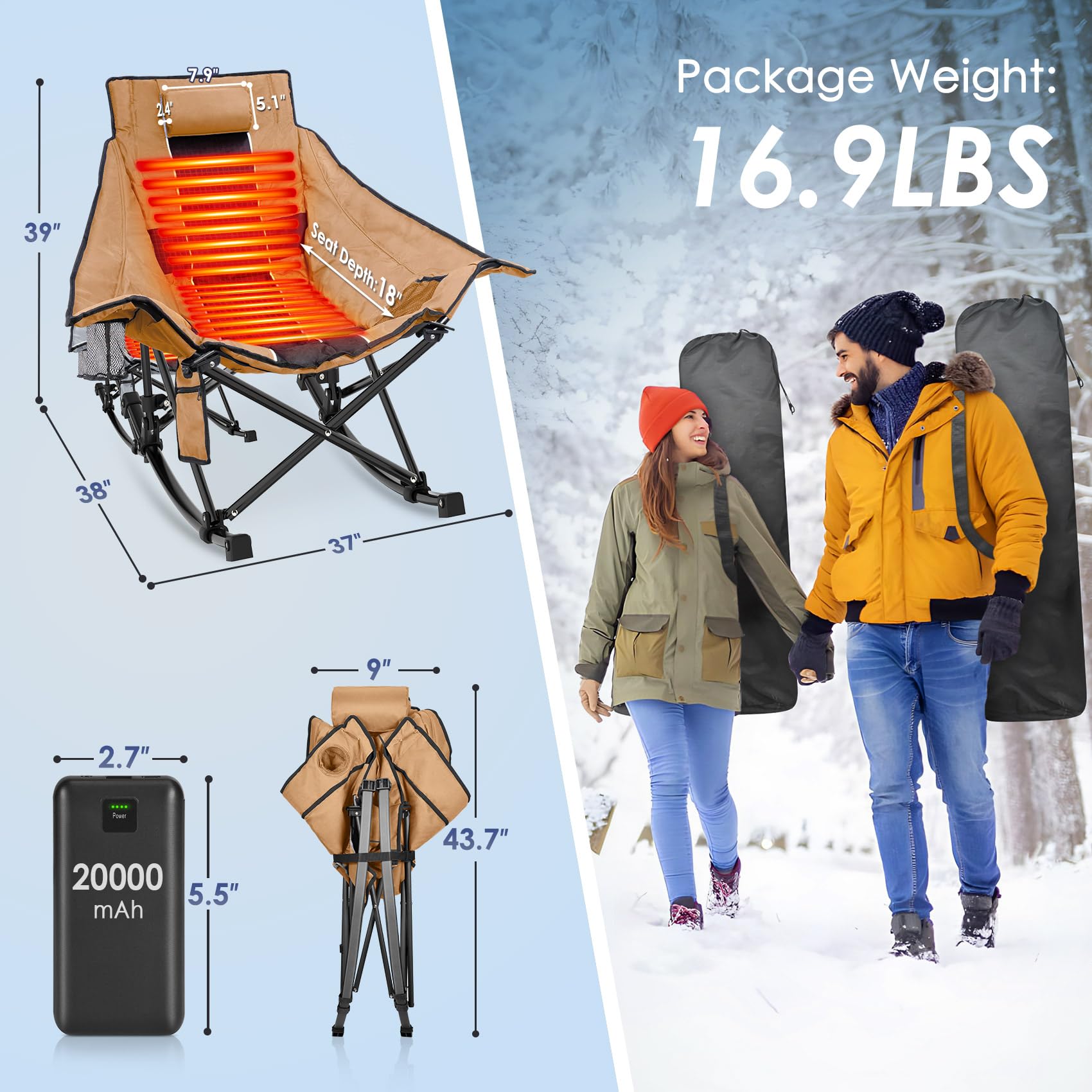- 【Comfort and Durability】In addition to heating, this rocking camping chair with 1mm thickness 22 mm diameter square tubes is designed with comfort in mind, featuring padded seats and backs, and even armrests. The heated chair is made of double-layered durable 600D Oxford fabric that are durable and suitable for outdoor use, ensuring longevity and resistance to the elements