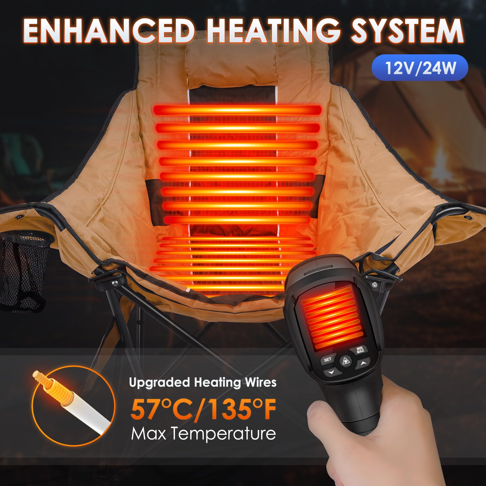 - 【Convenient & Practical】No assembly required, unfolds and folds back in seconds, very convenient. Whether for winter camping trips or autumn bonfires, this heated outdoor chair is your companion for all seasons. The integrated heating element ensures added comfort at lower temperatures. The heated outdoor chair is sure to enhance the outdoor experience for enthusiasts in lawns, gardens, porches, or balconies