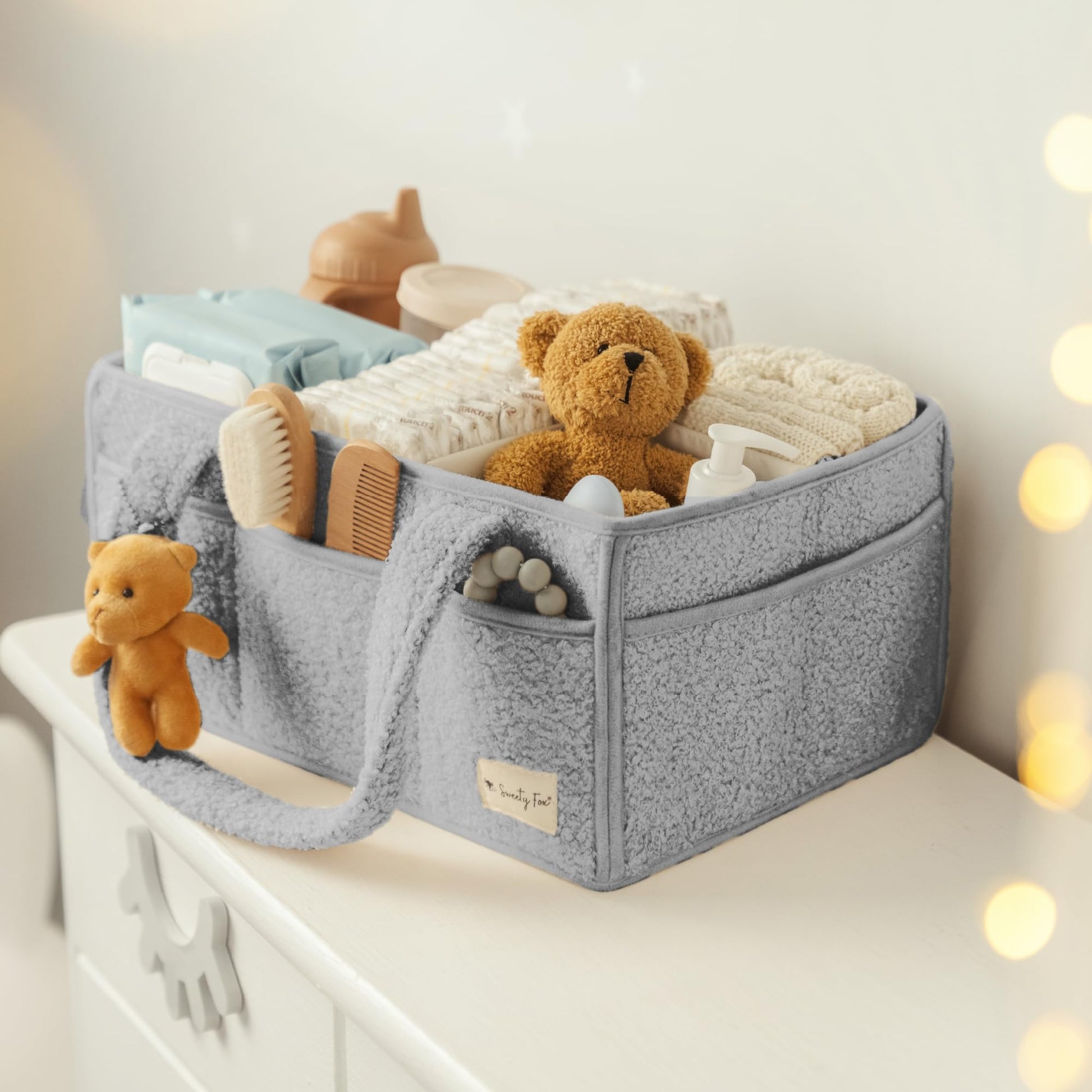 Sweety Fox Baby Diaper Caddy Organizer with Handle - Portable Sherpa Nursery Basket - Car Diaper Organizer, Cleaning Caddy, Gift for Baby Shower - Grey