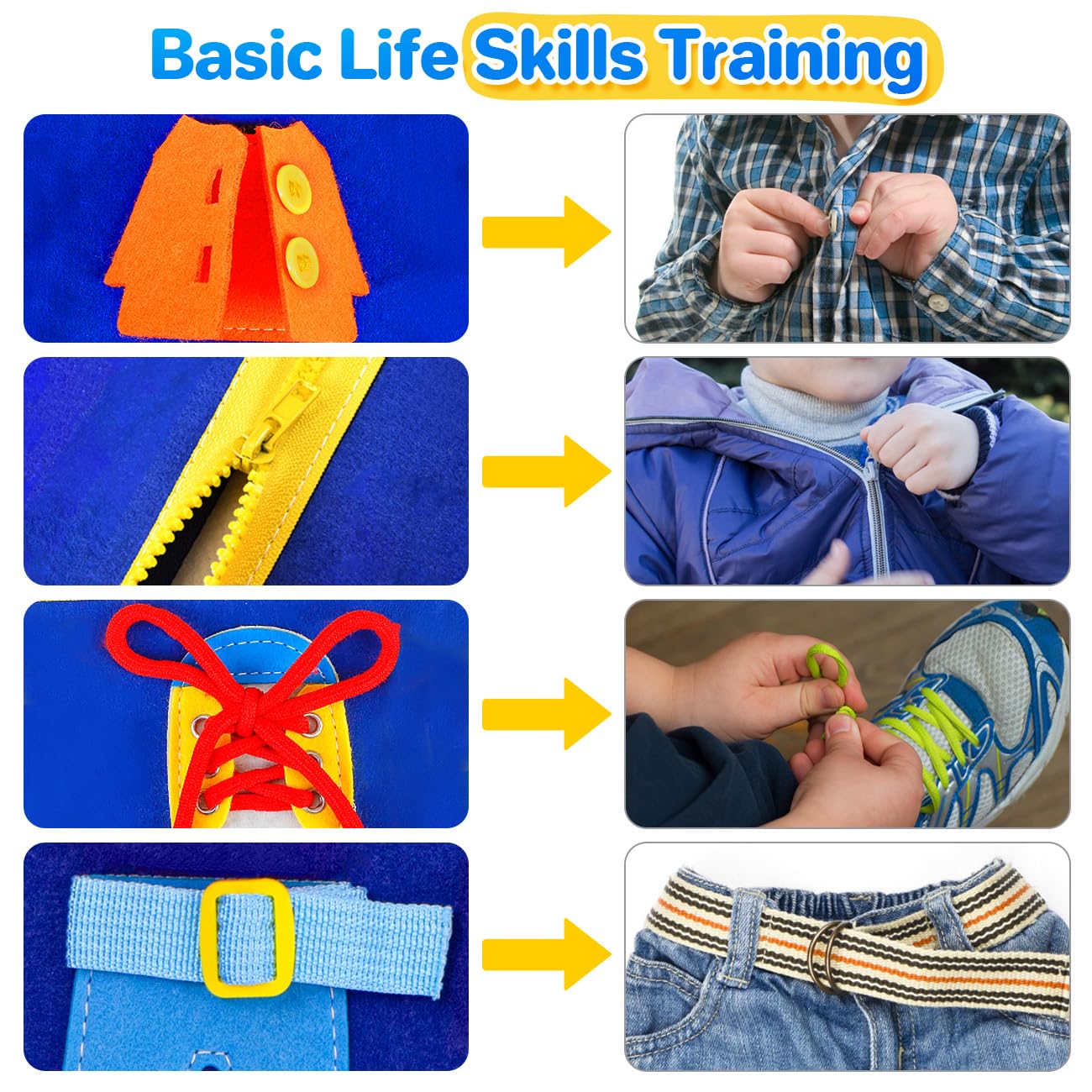 - ✨ Learn Practical Life Skills - The life skills learning board features 15 sensory activities to teach toddlers how to get dressed, buckle, snap, button, and tie. It works montessori inspired practical life skills, fine motor skills, probelm-solving skills, logical thinking and hand-eye coordination and will keep your little one entertained for a while.