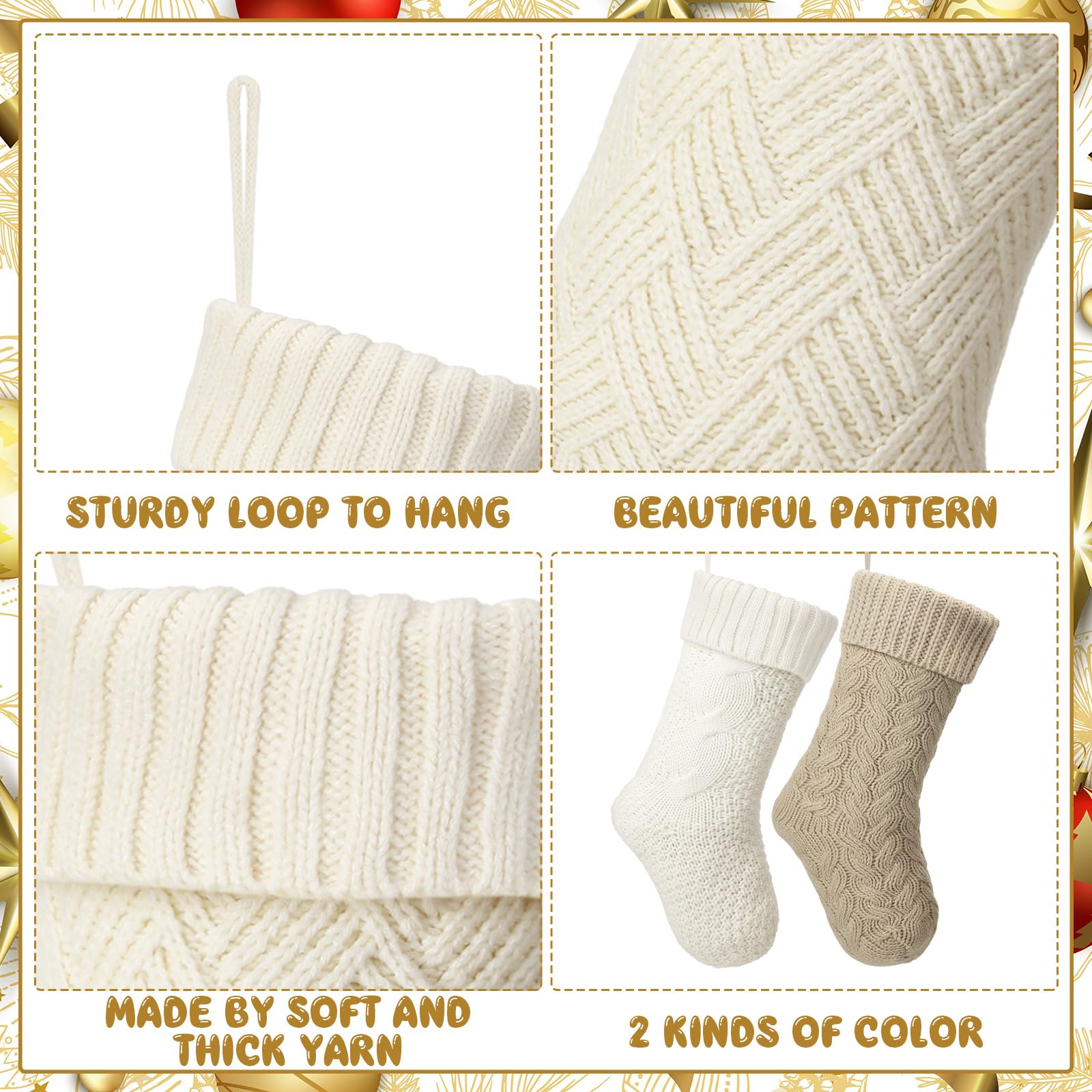 - Christmas Stockings: 4 packs of 18 inches handmade knitted Christmas stockings and 2 packs of 15 inches Xmas stockings; 2 colors, 3 in khaki and 3 in cream, 6 different handmade cable knit patterns add clean natural tones to your Christmas party decor, a suitable addition to holiday decorations and seasonal decor