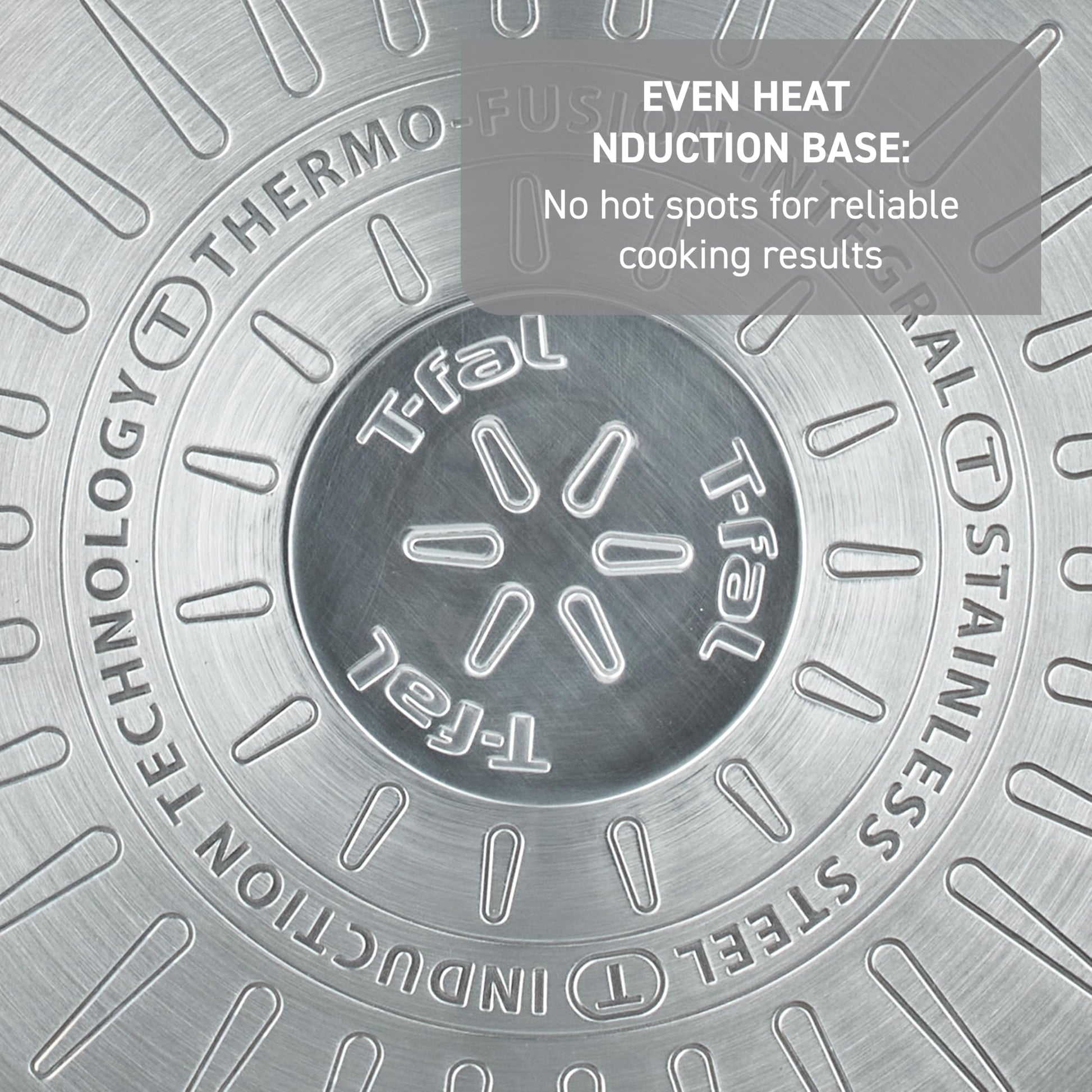 Details: Extra convenience for everyday cooking with the T-fal Stainless Steel Collection 11-Piece cookware Set. This kitchen essential set has convenient features like straining lids, pouring spouts, measuring marks and riveted Stainless Steel handles make cooking a breeze. This pots and pans set Includes 8” frypan, 10” frypan, 3.5qt covered sauté, 1.5qt covered saucepan, 3qt covered saucepan, 7qt stockpot, and a Stainless Steel steamer. Stainless steel construction ensures long lasting performance for a staple in your kichen, and the Stainless Steel interior maintains the purity of flavor. Even heat Induction base ensures no hot spots for easy cooking. Dishwasher and oven safe up to 500°F; compatible with all cook tops, including Induction.