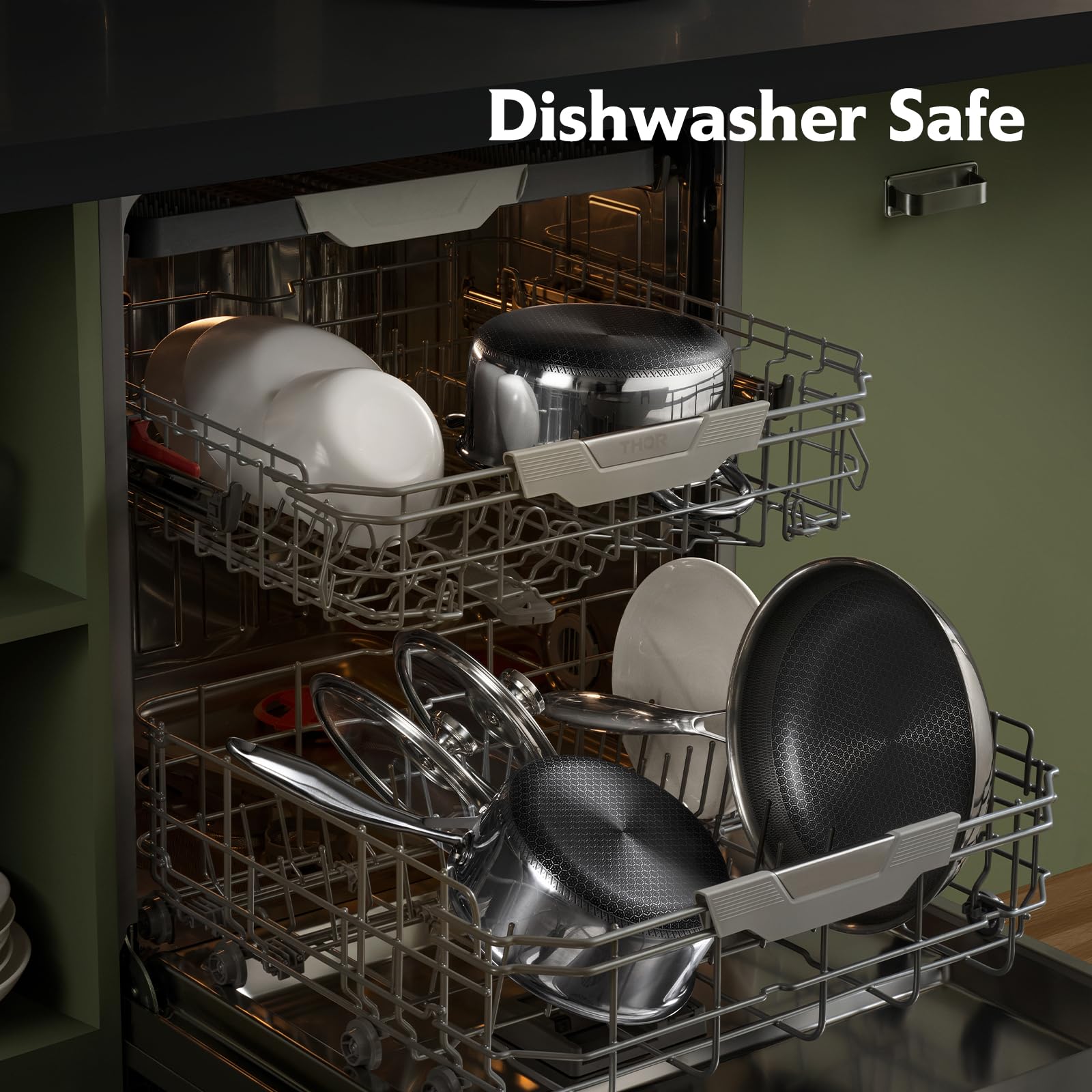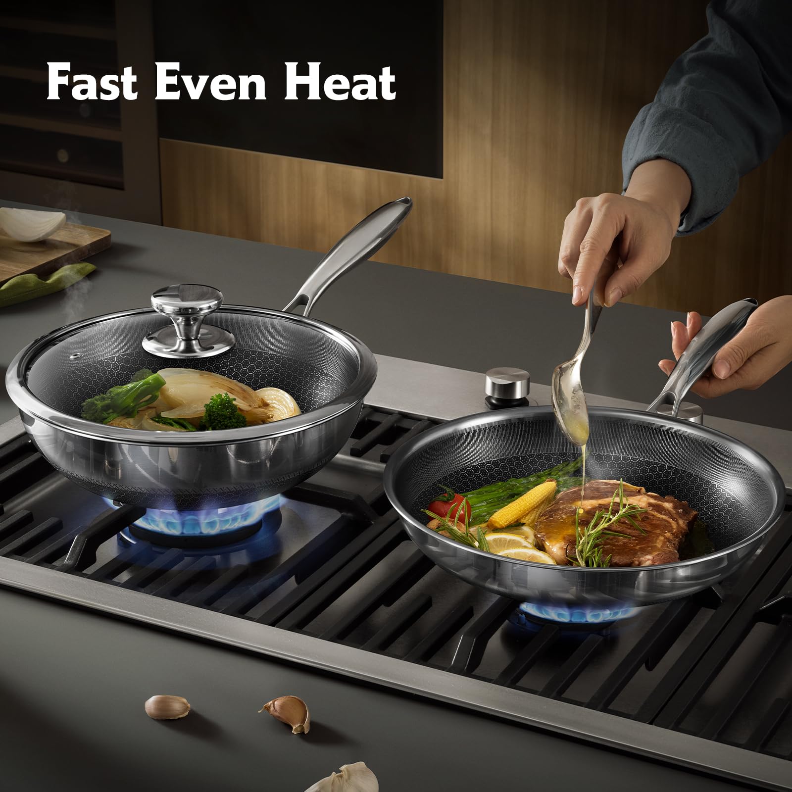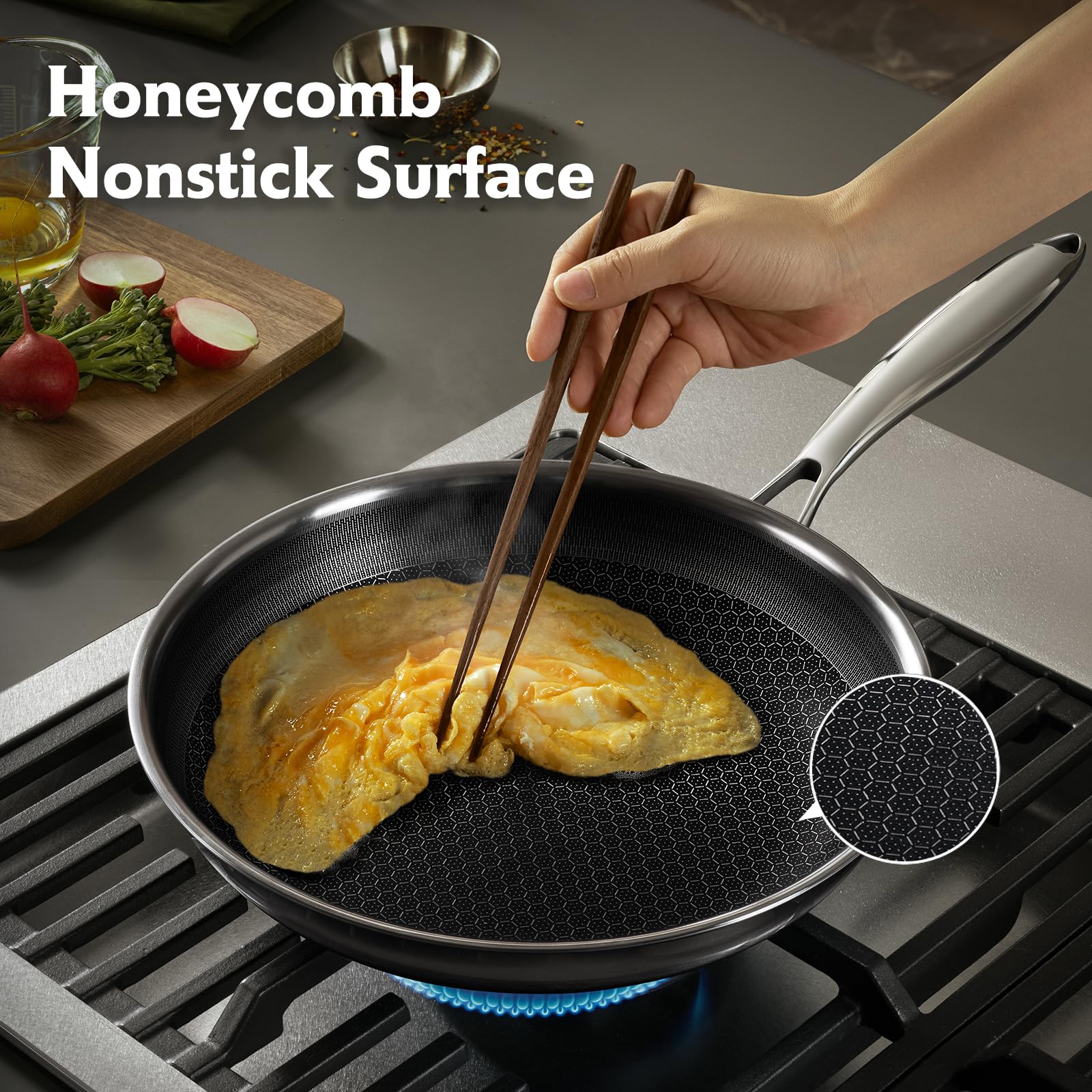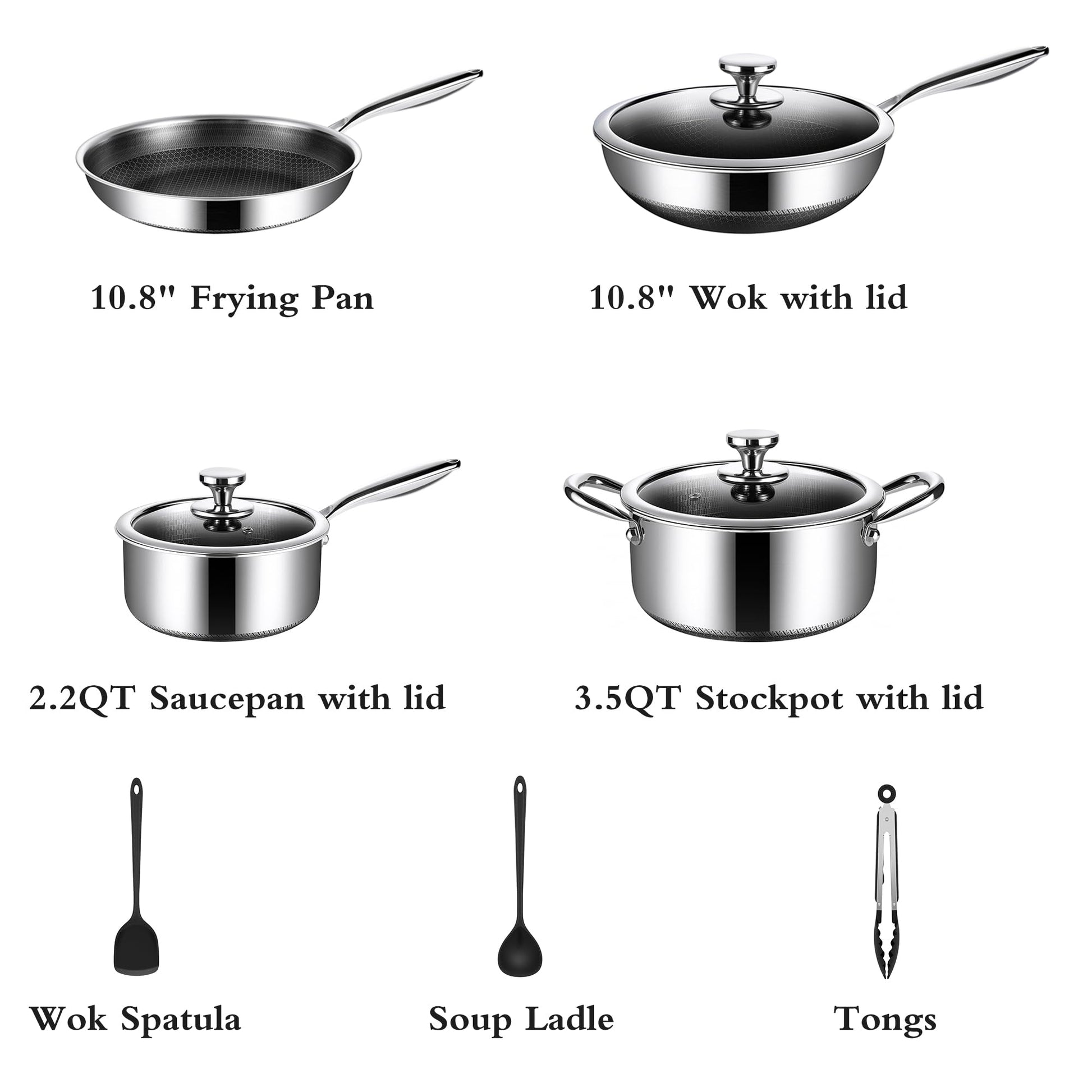 - 【Stainless Steel Cookware】Crafted with premium stainless steel and a healthy PFOA-free honeycomb coating, offering scratch resistance, excellent non-stick performance, and extended durability for your stainless steel pots and pans set