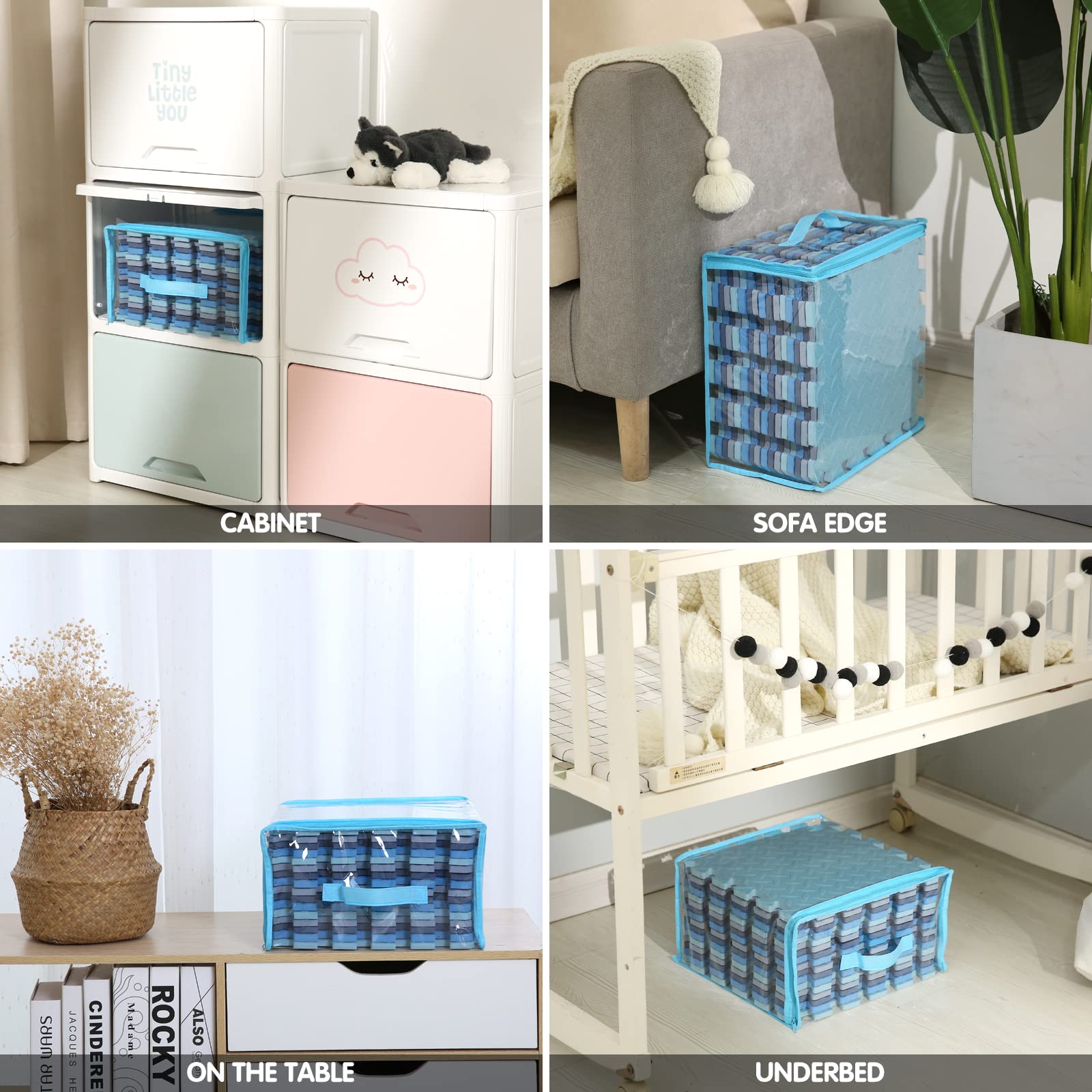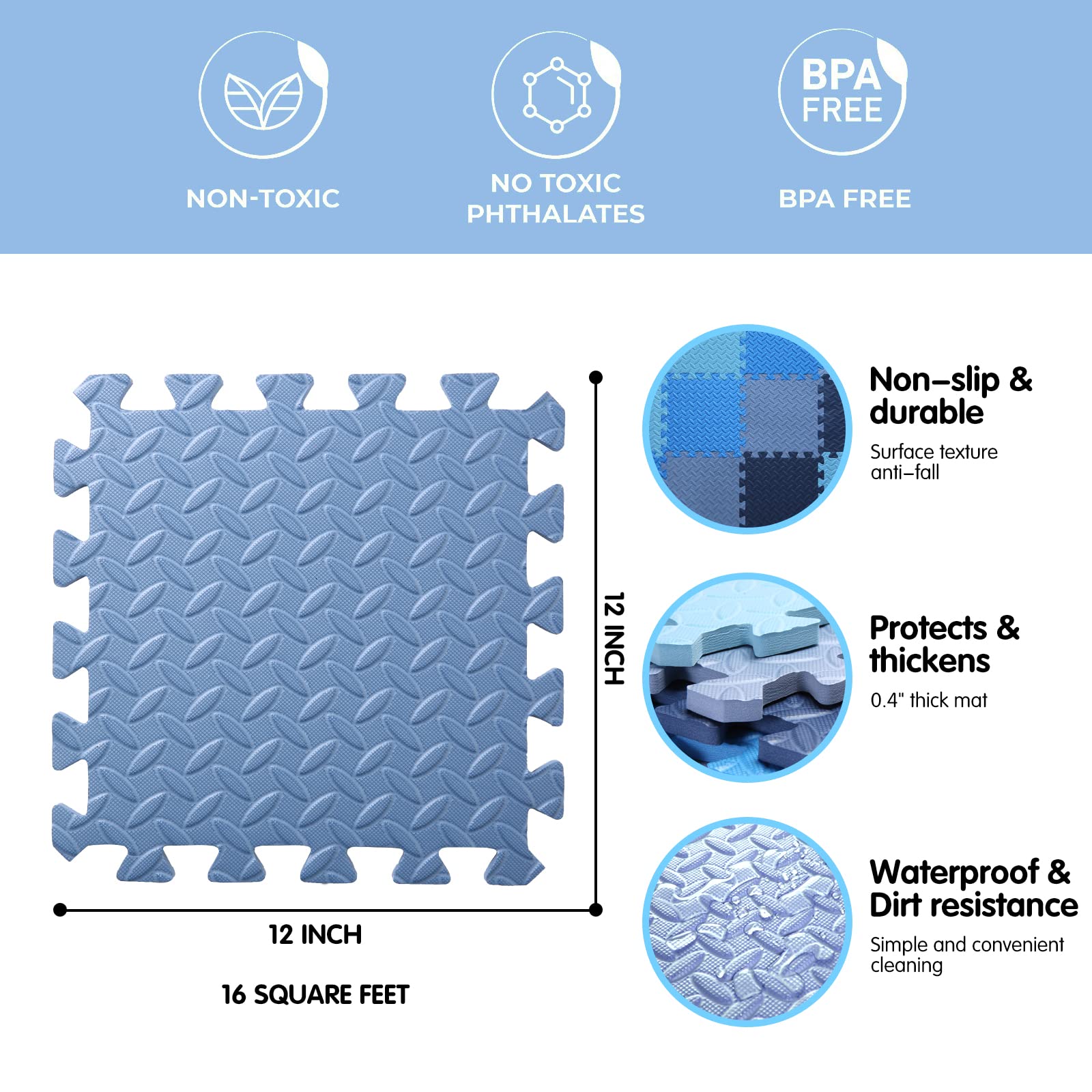 • 🔥16 Tiles/Set EVA Baby Play Mat --- (Dark Blue- 4 Tiles, Gray Blue-4 Tiles, Light Blue- 4 Tiles, Blue- 4 Tiles), 1 Pcs size is (11.81*11.81 inch). Thickness is (0.4 inch). 4*4 area is 16 sq.ft. Tamiplay foam floor mats sold without borders