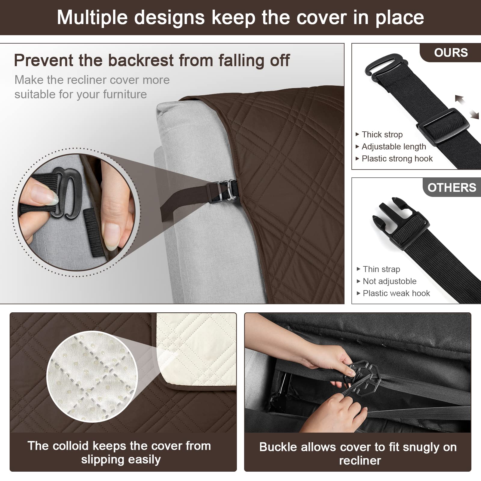 - 【REDUCE SLIP-OFF CONCEPT】Reduce movement around! 1. Solid round colloid design on the back of our recliner cover; 2. Additional flexible elastic straps; 3. Two elastic bands at seat's back side and the matching buckle, to reduce the sliding of the recliner chair slipcover, even on the leather furnitures