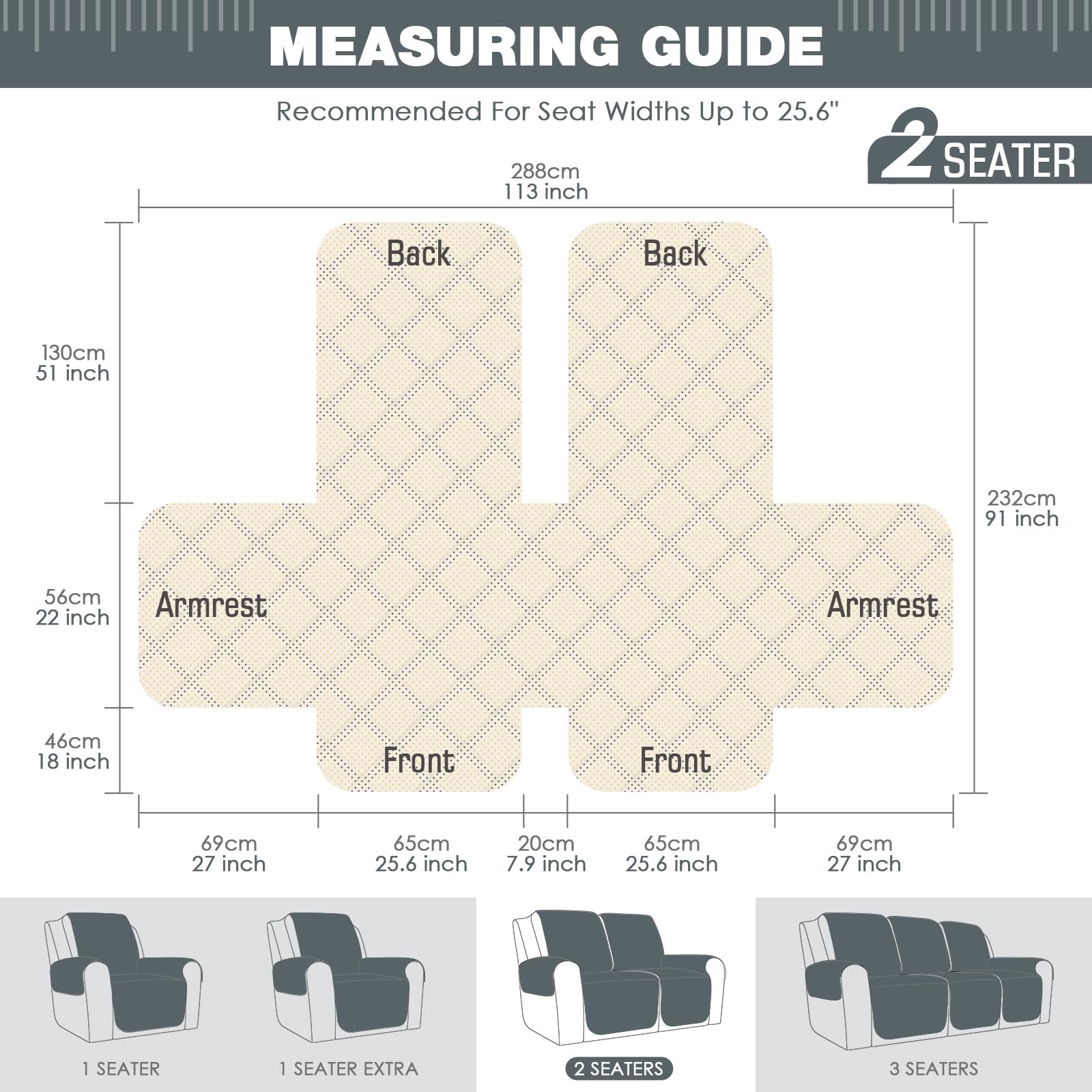- 【DIMENSIONS GUIDE】 New colors and styles will make your furniture more unique and welcoming. 2 seater recliner slipcover fit a loveseat with a seat width of 51.2 in, see measurement guide in photos. NOTE: Please confirm the size before purchasing
