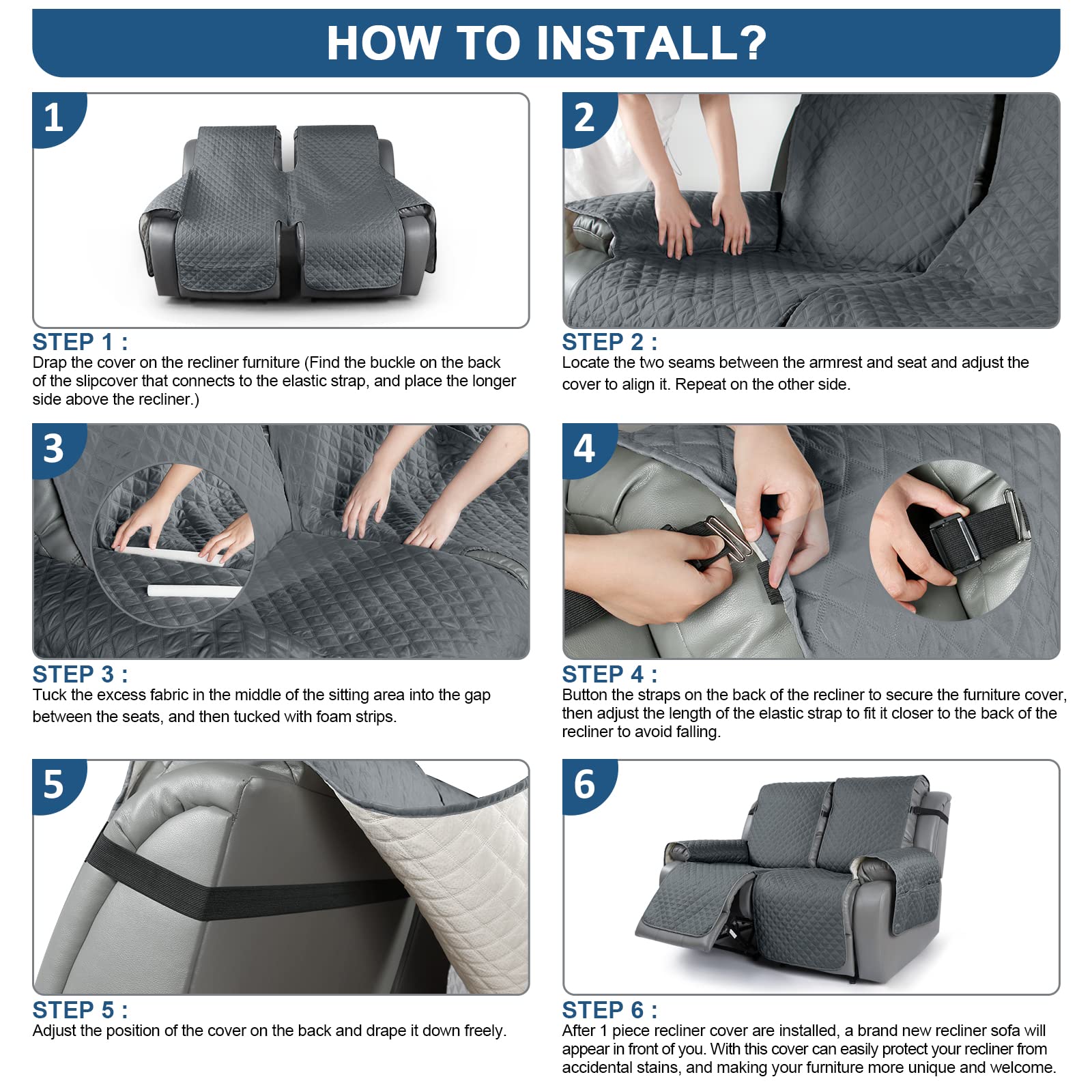 - 【REDUCE SLIP-OFF CONCEPT】 1.Solid round colloid design on the back of our recliner cover; 2.Additional flexible elastic straps and foam strips, 3.Two elastic straps on the bottom of the seat cover and matching buckles (only two)