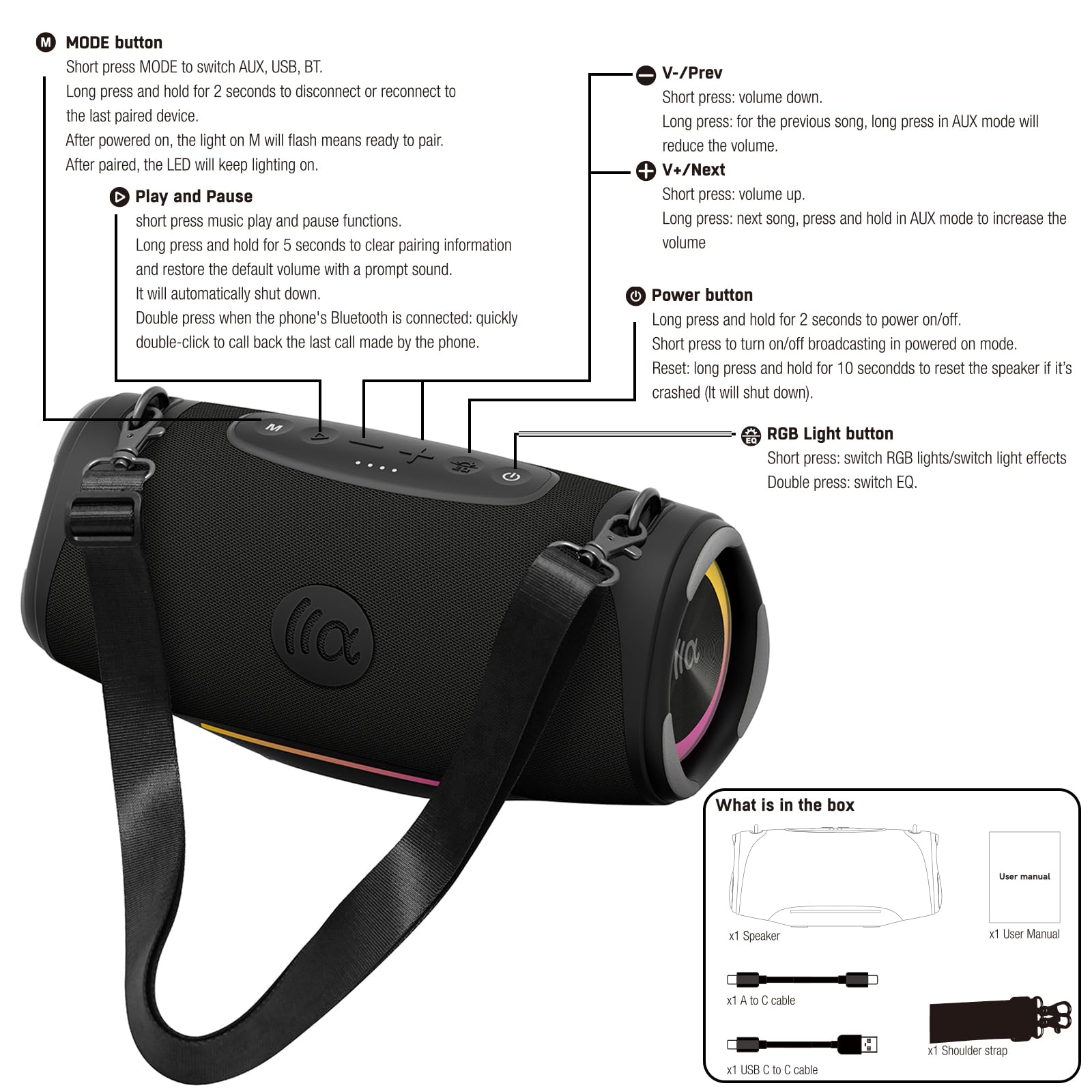 - Multifunctional: LED Lights, AUX, Hands-Free : More than a loud Bluetooth speaker, it boasts vibrant LED party lights, AUX/USB playback, and noise-canceling mic for clear calls. A must-have for camping, showers, or BBQs—wherever you crave zero-distortion sound