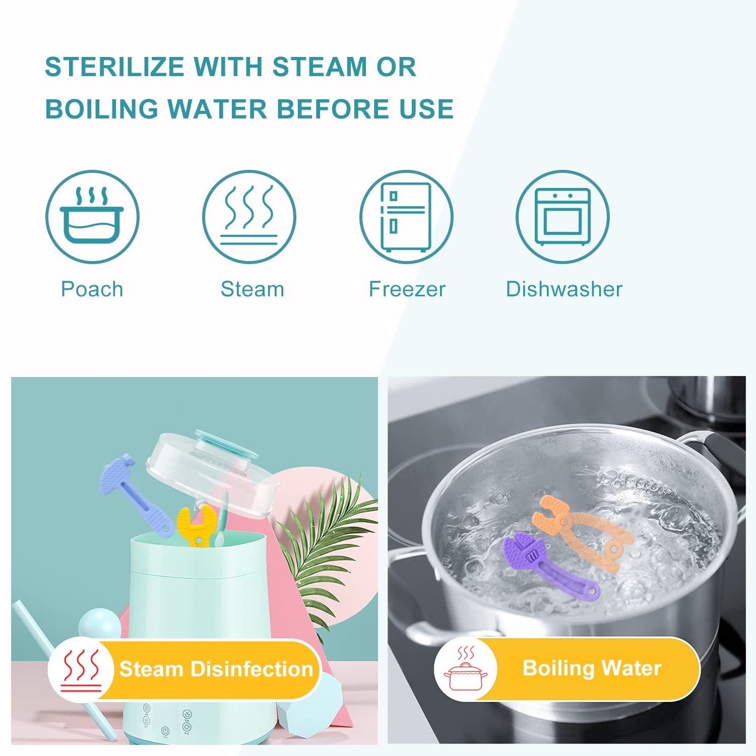 - Unique Design Baby Teethers: Your baby will get four different unique tool shapes and colors of baby teethers 3-6 months (Hammer, Wrench, Spanner, Pliers) with pacifier clips. Bright color for visual stimulation and make it easy for them to find the silicone teethers for babies