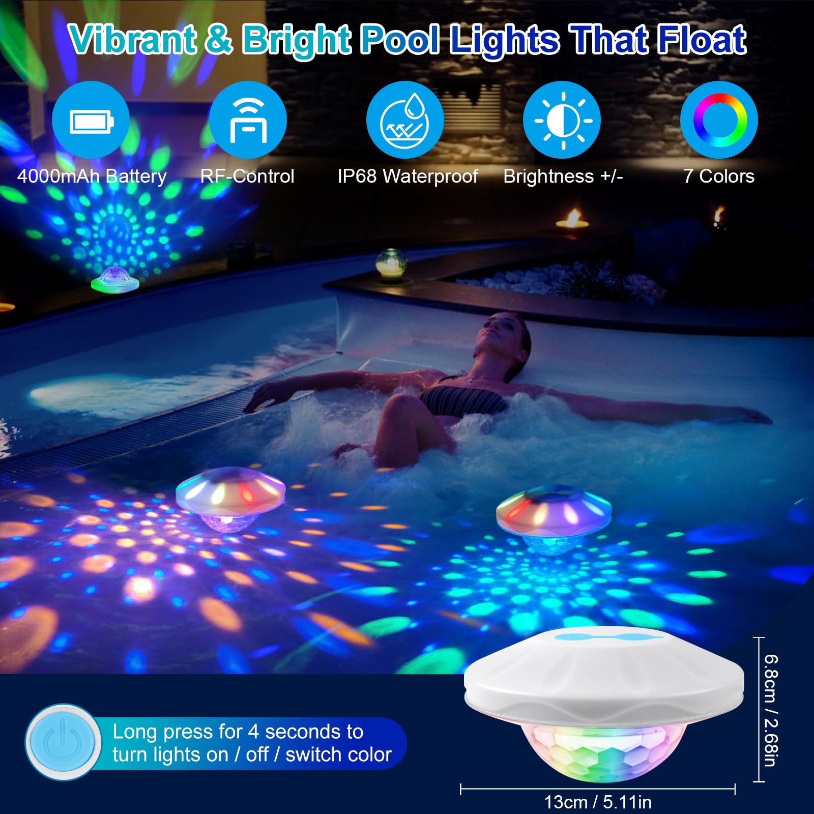 - Colorful Pool Floating Lights: Our rechargeable swimming pool lights have designed float above water, which have 7 static colors (red, green, blue, purple, yellow, cyan, white), 6 dynamic modes(flash, flow, smooth, chase1, chase2, chase3), 2 timer options(2h, 4h), 5 brightness adjustable levels and memory function. You can also select the different colors by pessing the remote control buttons, it can display vibrant colors and lighting shows, which bring you a wonderful visual feast and creat great atmosphere.