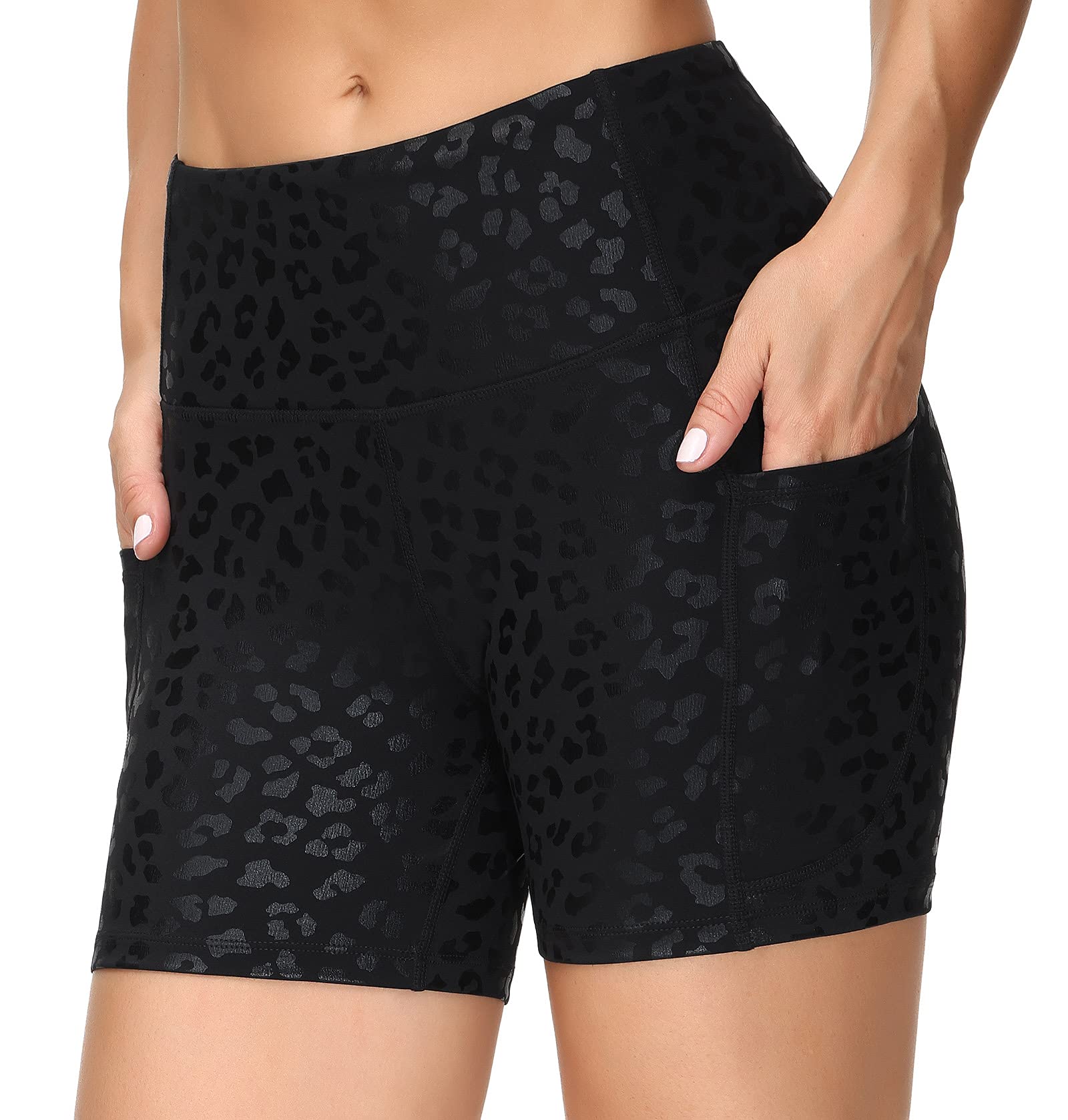 THE GYM PEOPLE High Waist Yoga Shorts for Women Tummy Control Fitness Athletic Workout Running Shorts with Deep Pockets (Medium, Black spot Leopard)