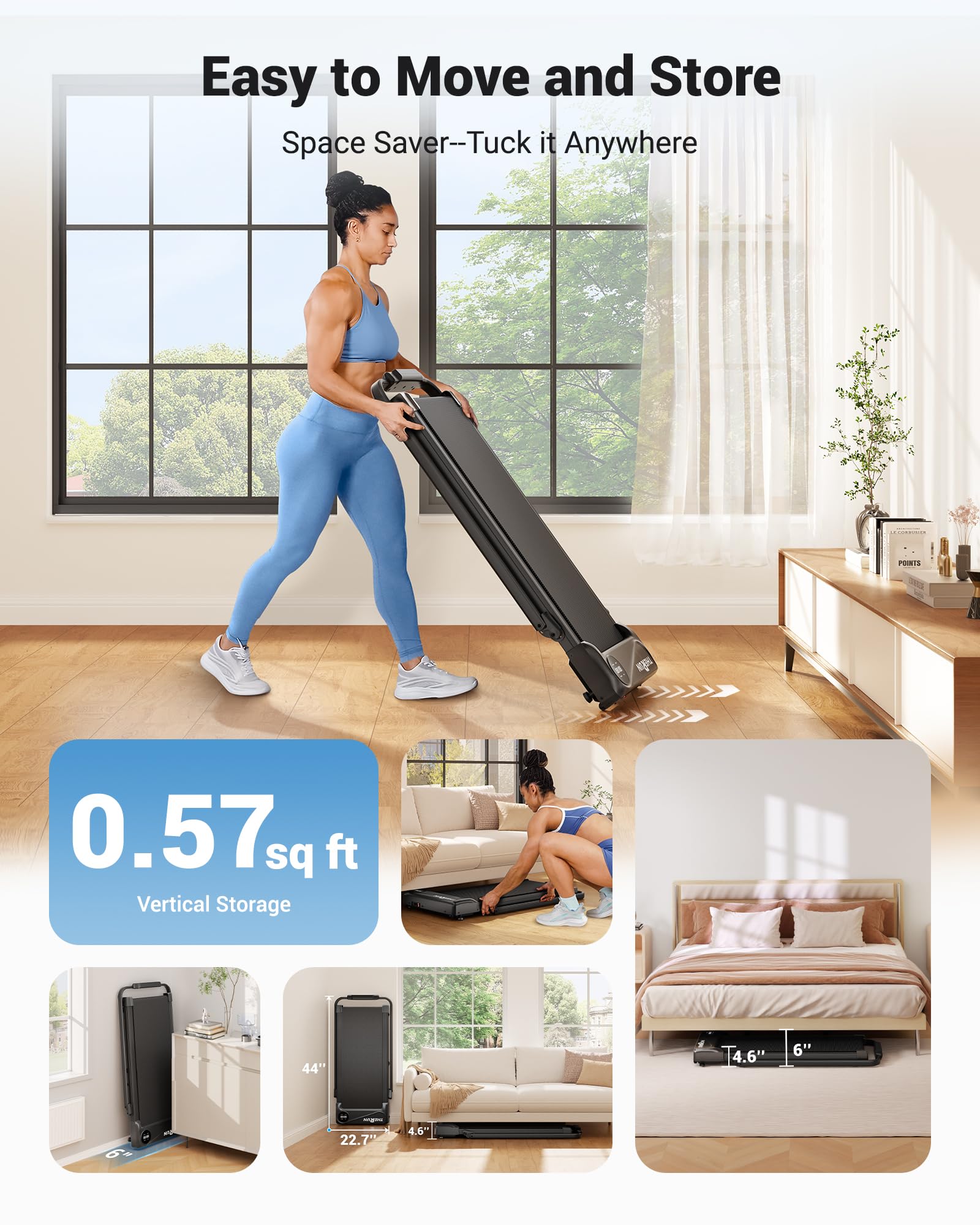 - Installation Free, Space Save Design: Compact treadmill arrives fully assembled and ready to use straight out of the box. This small treadmill with transportation wheels, folds only less than 4.5 inches thick after use, you can easily move and store it under the office desk, sofa, corner or bed, largely save your home apartments and office spaces