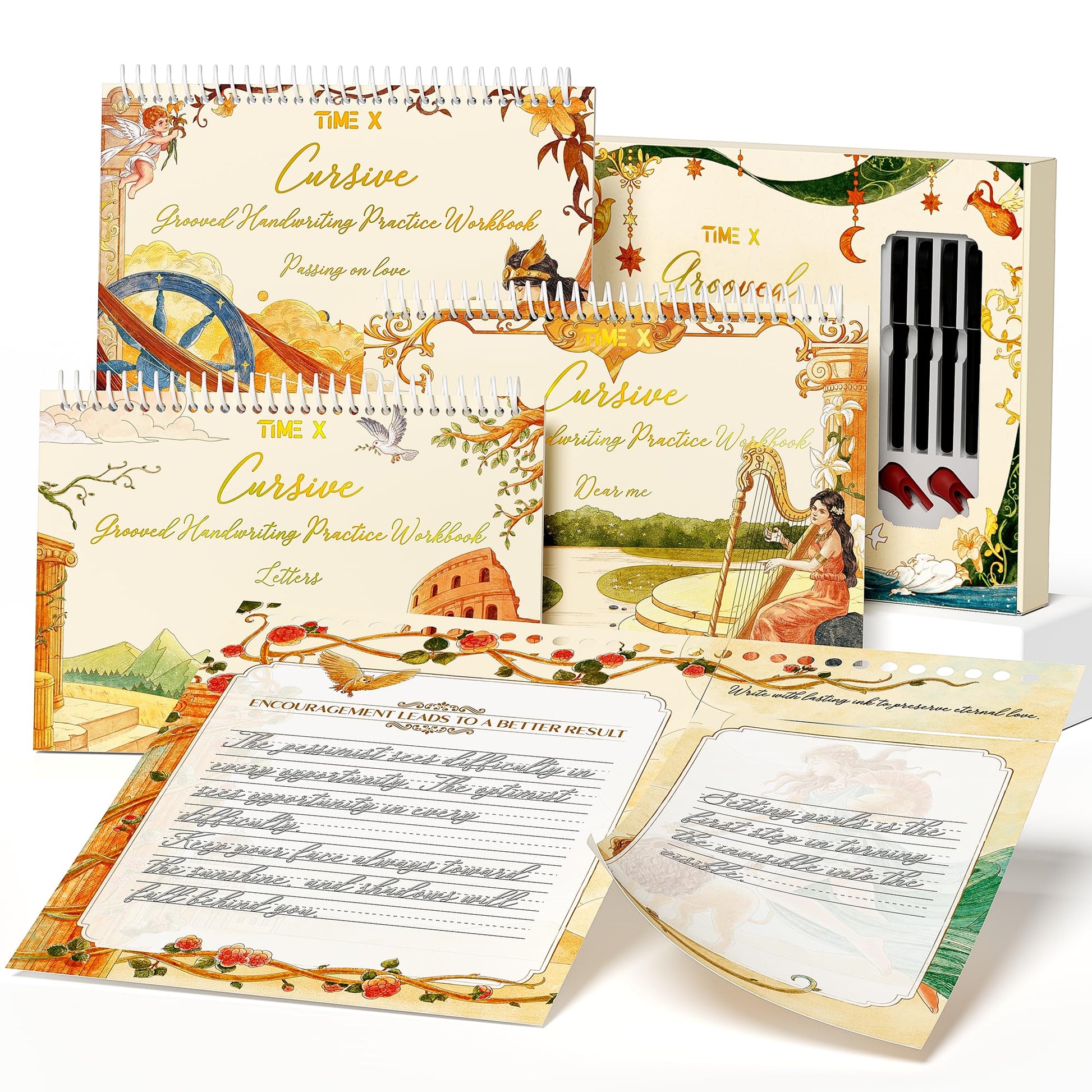 TIME X Grooved Cursive Handwriting Workbook Kit - Cursive Handwriting Workbook for Kids 8-12 and Adults - 3Pcs Magic Reusable Handwriting Workbook with Detachable Quote Postcards - 12.6"x10.6"