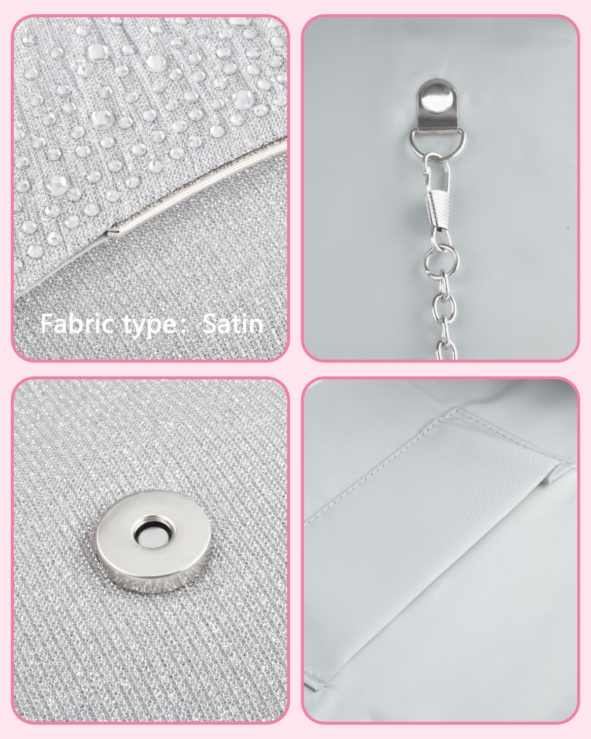 - UNIQUE DESIGN - Front flap with magnetic button closure. Made of high quality satin fabric and decorated with clear rhinestone overlay, sparkly glitter rhinestones in varied sizes on flap.